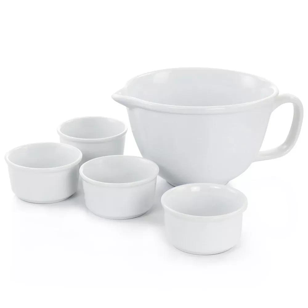 des one 2qt batter bowl and 4-8oz matching ramekins. Bake custards, cakes, flans, and a variety of other individual serving dishes with this set and enjoy without having to transfer to a plate! Ramekins are oven, microwave safe, and dishwasher safe; batter bowl is dishwasher and microwave safe. Set Includes: One 1-2qt (1.89L) Batter Mixing Bowl Four 4-8oz (236ml) Ramekins Per Item Measurements: Batter Bowl: 8in diameter, 11in length with handle, 5.4in height, 1-2qt capacity, 3.10lb weight Ramekins: 4in diameter, 1.75in height, 4-8oz capacity, 0.45lb weight