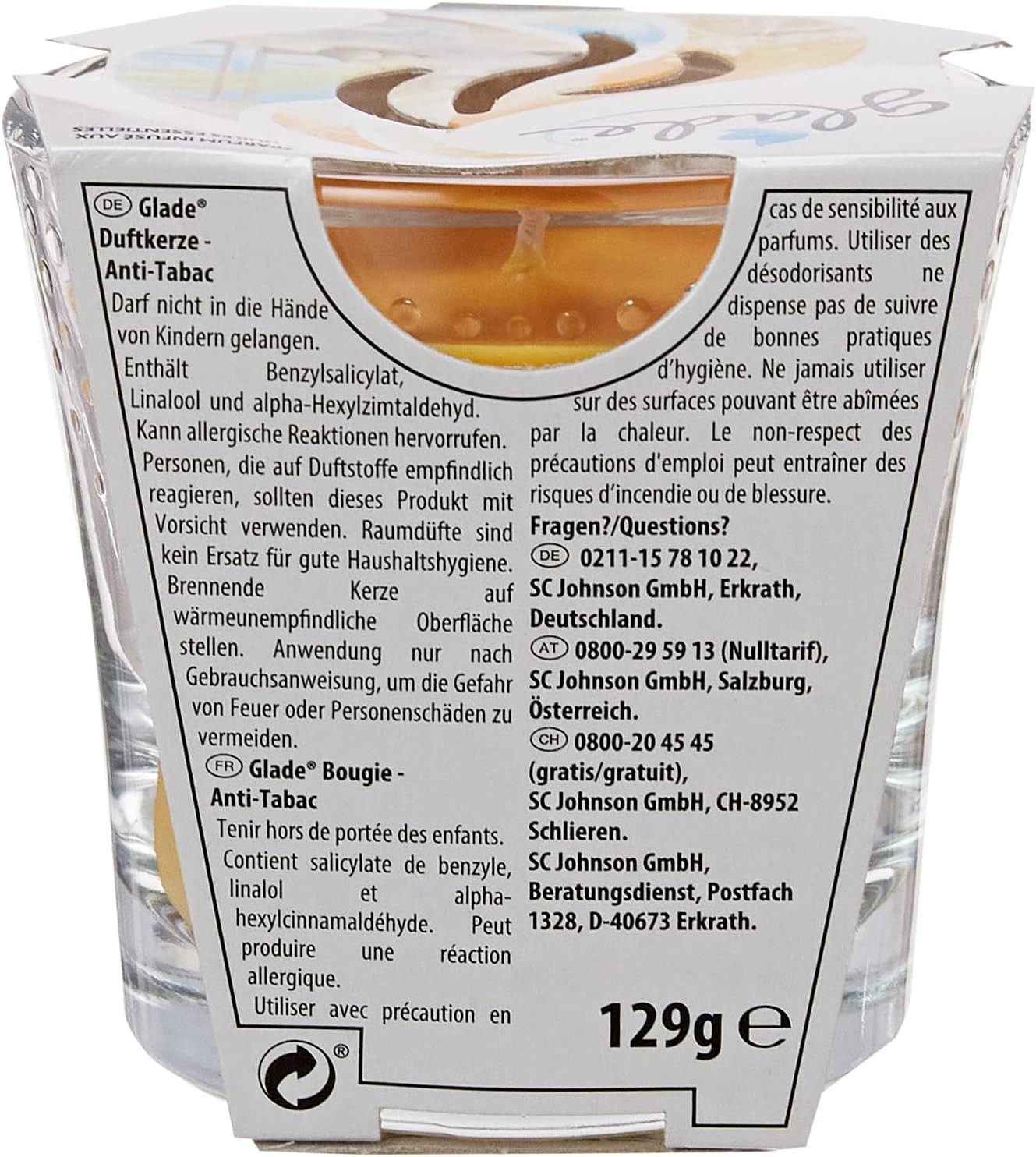 Awaken your senses and let any room shine in the distinctive glow of candlelight. Glade scented candles fill your home with masterfully assembled fragrances enriched with essential oils. Choose from our wide range of unique fragrances. The combination of the seductive Glade fragrance notes makes us dream of holiday or awakens our memories of past childhood experiences. Special fragrances create a sense of satisfaction and are often associated with memories and associated emotions. Our sense of smell has it all: with about 20 million odour cells on ten square centimetres of mucous membrane, it can distinguish thousands of fragrances. It only needs a tiny amount for identification: it is sufficient if a trillion air molecules comes a single fragrance molecule. Without any modification of it, each fragrance is stored in a kind of fragrance registry after its identification. When we perceive the fragrance again, this recognition automatically connects to the stored event - and we remember! Note: Glade Scented Candles are designed for indoor use. This does not rule out that they can also be used in the protected outdoor area of your home. Always make sure that the wick does not exceed approx. 0.5 cm. If necessary, cut it a little. Also make sure that the candle is not in the draughts, as this promotes smoke or soot formation. Never leave candles unattended. The candle jar is reusable by refilling the empty glass with decorative litter or sand and e.g. Place a tea light on it. Disposal of the remaining empty glass is environmentally friendly via public glass collection po