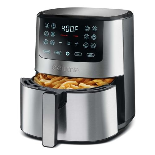 With Gourmia's digital deep fryer, you can toast, grill, bake, and fry to perfection without a drop of oil. The cooking settings let you fry everything with a single touch. Comes with easy-to-follow notifications for adding food after preheating and turning food during cooking. Cooks quickly and evenly. Makes food crispy on the outside and moist on the inside, using 80% less fat. Perfect for preparing delicious meals for the family. The stainless steel design adds a modern touch to any kitchen.