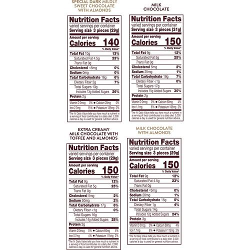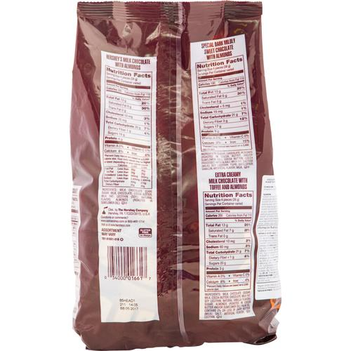 This pack includes: Hershey's special dark chocolate + Hershey's Milk chocolate with almonds + Hershey's milk chocolate + Hershey's extra creamy milk chocolate with toffee and almonds. 145 pieces per bag | Ready to eat | Store in a cool and dry place.