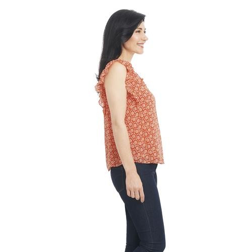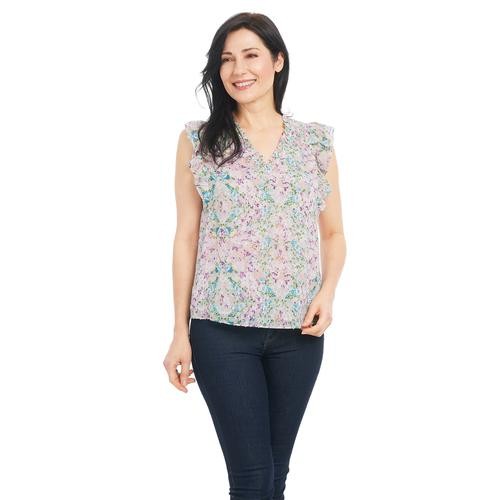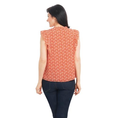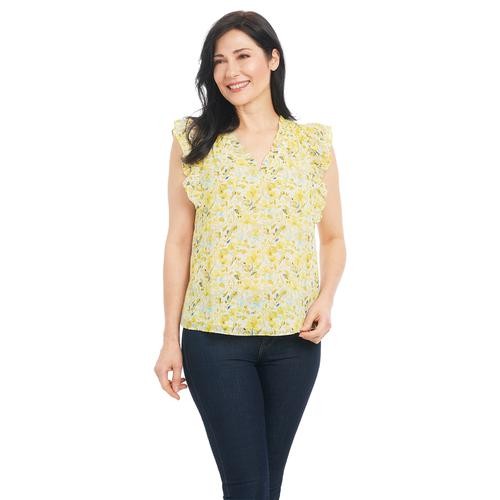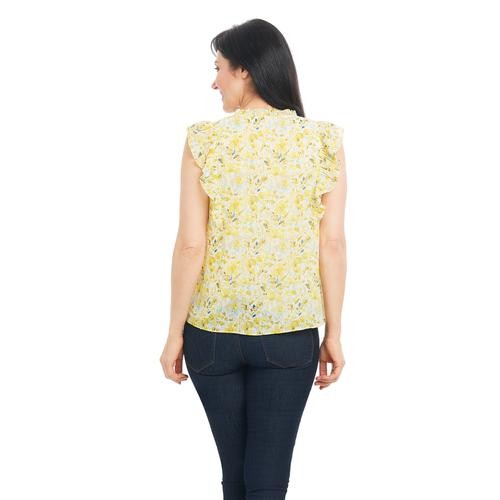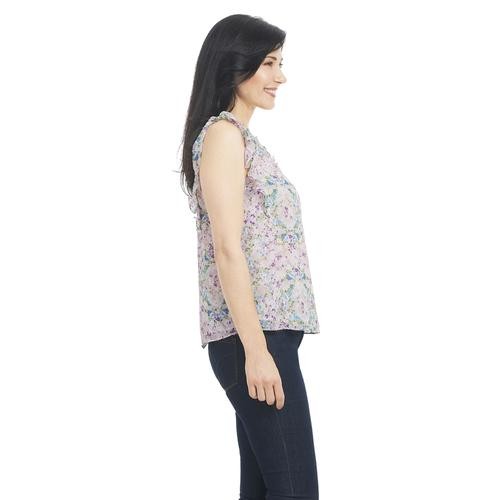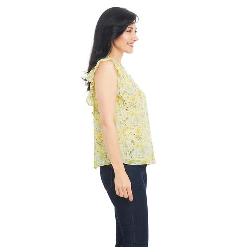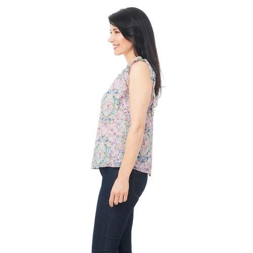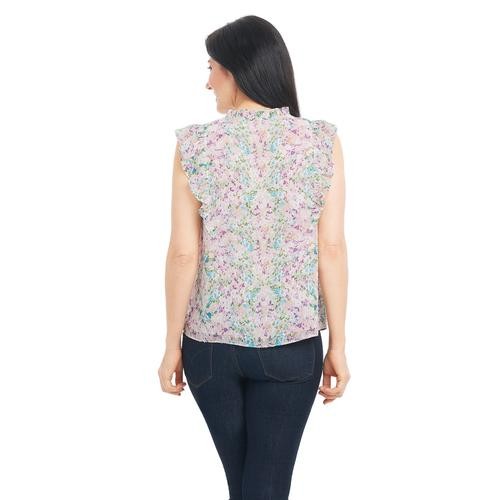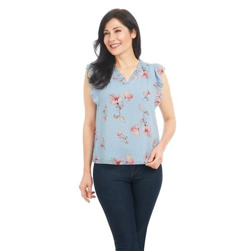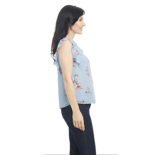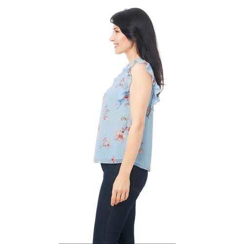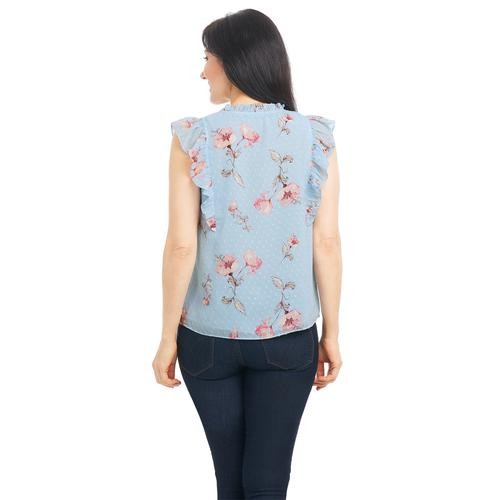 Feel pretty and cool in this sleeveless V-neck blouse with ruffles on the neck and shoulders. It's feminine, and stylish and pairs well with casual pants, a skirt, and even dark jeans. It comes in pastel shades with a pretty floral print.