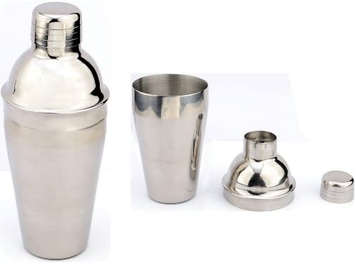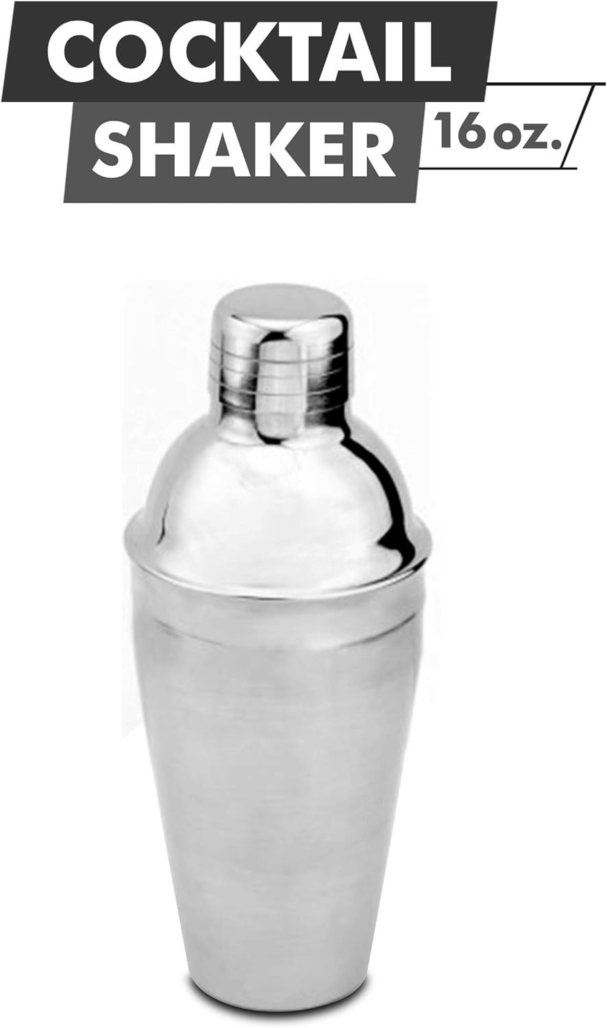 Home Basic 16 Ounce Stainless Steel Cocktail Shaker. This 16 Ounce Stainless Steel Cocktail Shaker gives you a simple way to prepare homemade martinis and cocktails. This three-piece bar accessory includes a 16 ounce stainless steel shaker, a strainer, and a lid that can also double as a shot glass to measure and add ingredients. This stainless steel shaker is ideal for use in the home, restaurant, or even the pub. As an added bonus, this unit is dishwasher safe for a quick and easy cleanup after a party or gathering.