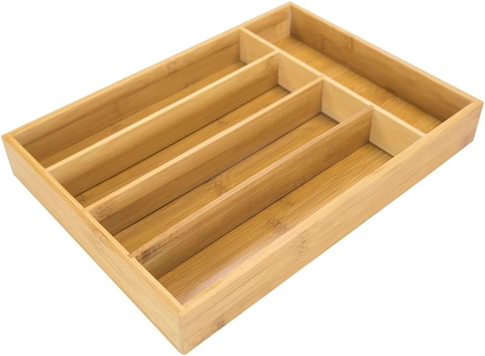 Home Basics CT01009 Cutlery Tray Bamboo. Bamboo cutlery tray offers extra storage into a kitchen drawer for flatware, silverware and utensil organization. Simplistic bamboo design of five separate compartments. Cutlery tray fits into kitchen drawer to aid in flatware organization. Bamboo construction is simplistic and natural. Includes five slots for various utensils; 10.25-Inch by 2-Inch by 14.25-Inch
