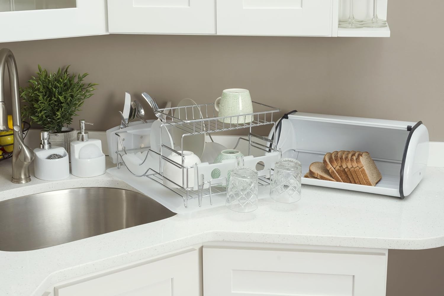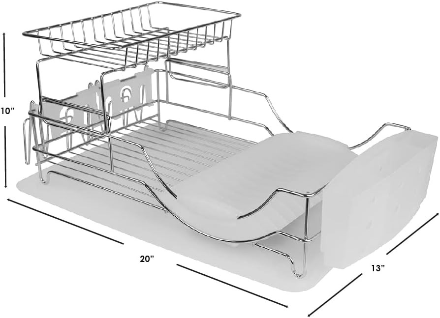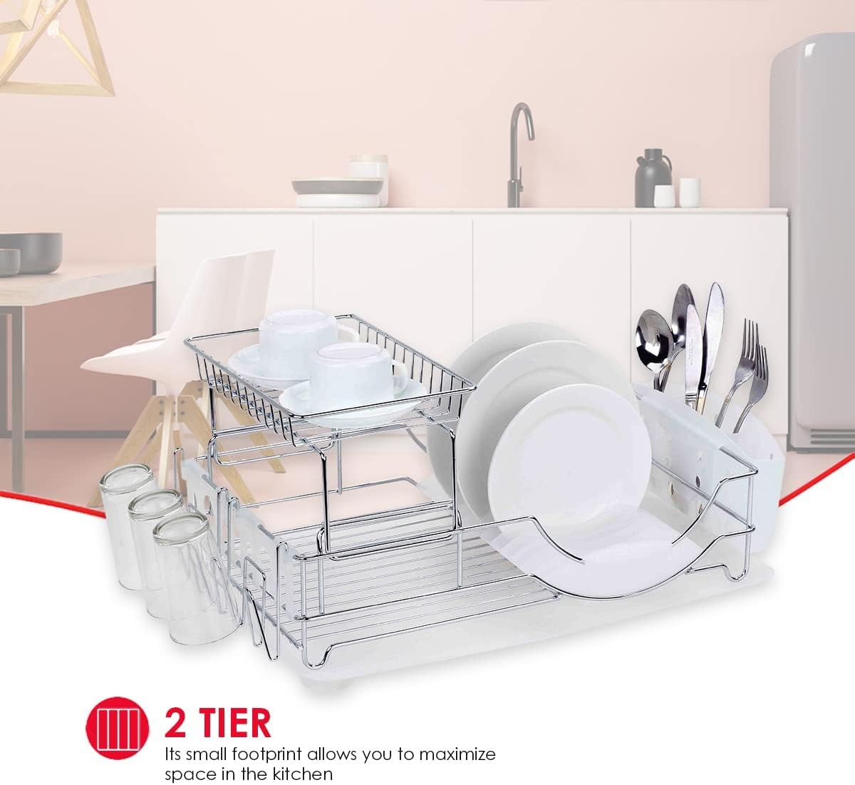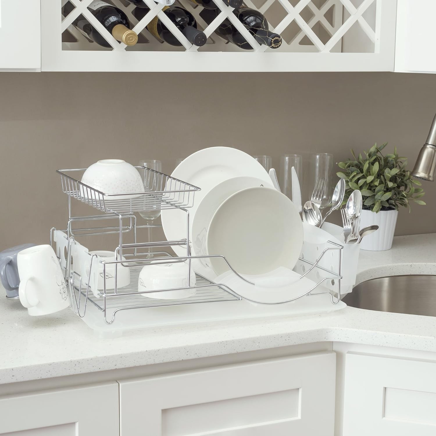 Home Basics DELUXE 2-Tier Dish RACK and Drainer, White. 2 Tier dish drainer provides storage space for dishes and cutlery. Features a convenient removable tray for easy drainage and also side mounting mug stand and cutlery holder. Ample space for draining and drying after washing. Made from high quality iron, with chrome finish to ensure more durability.