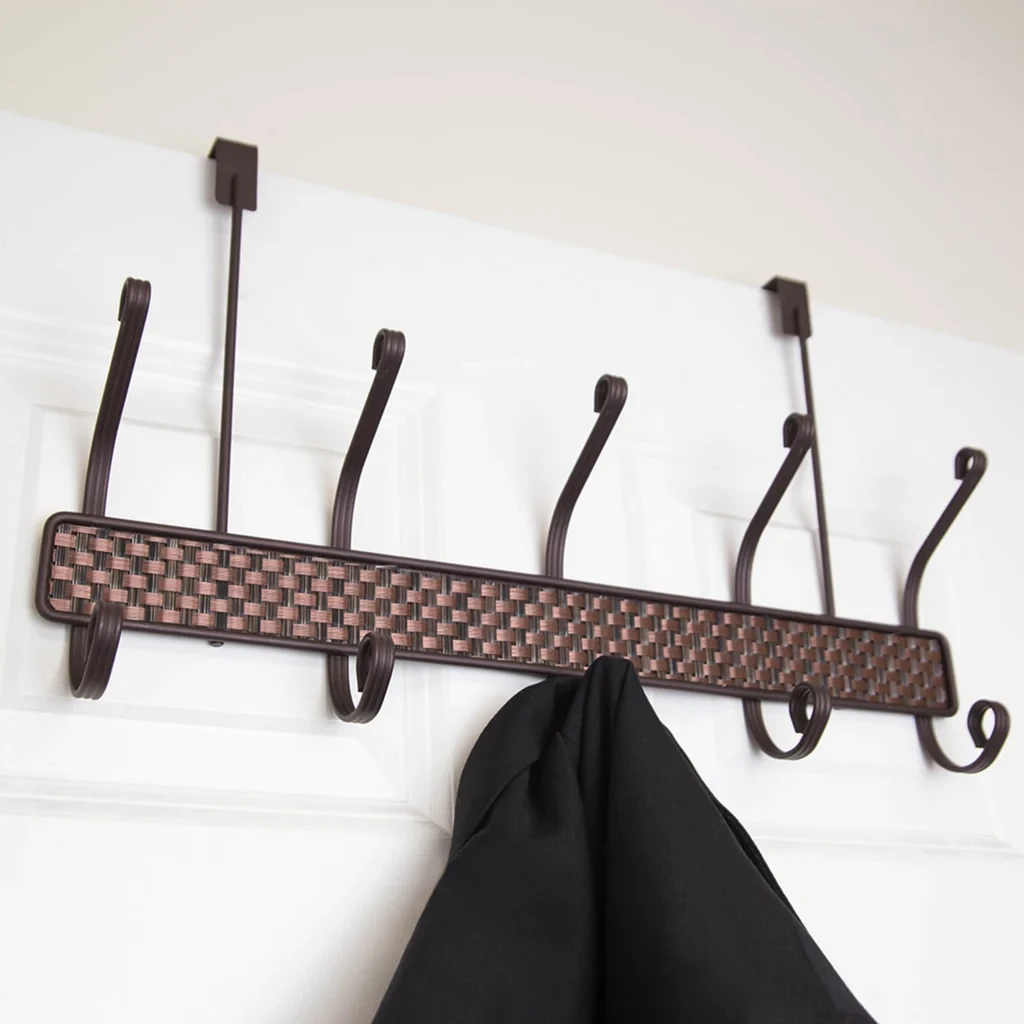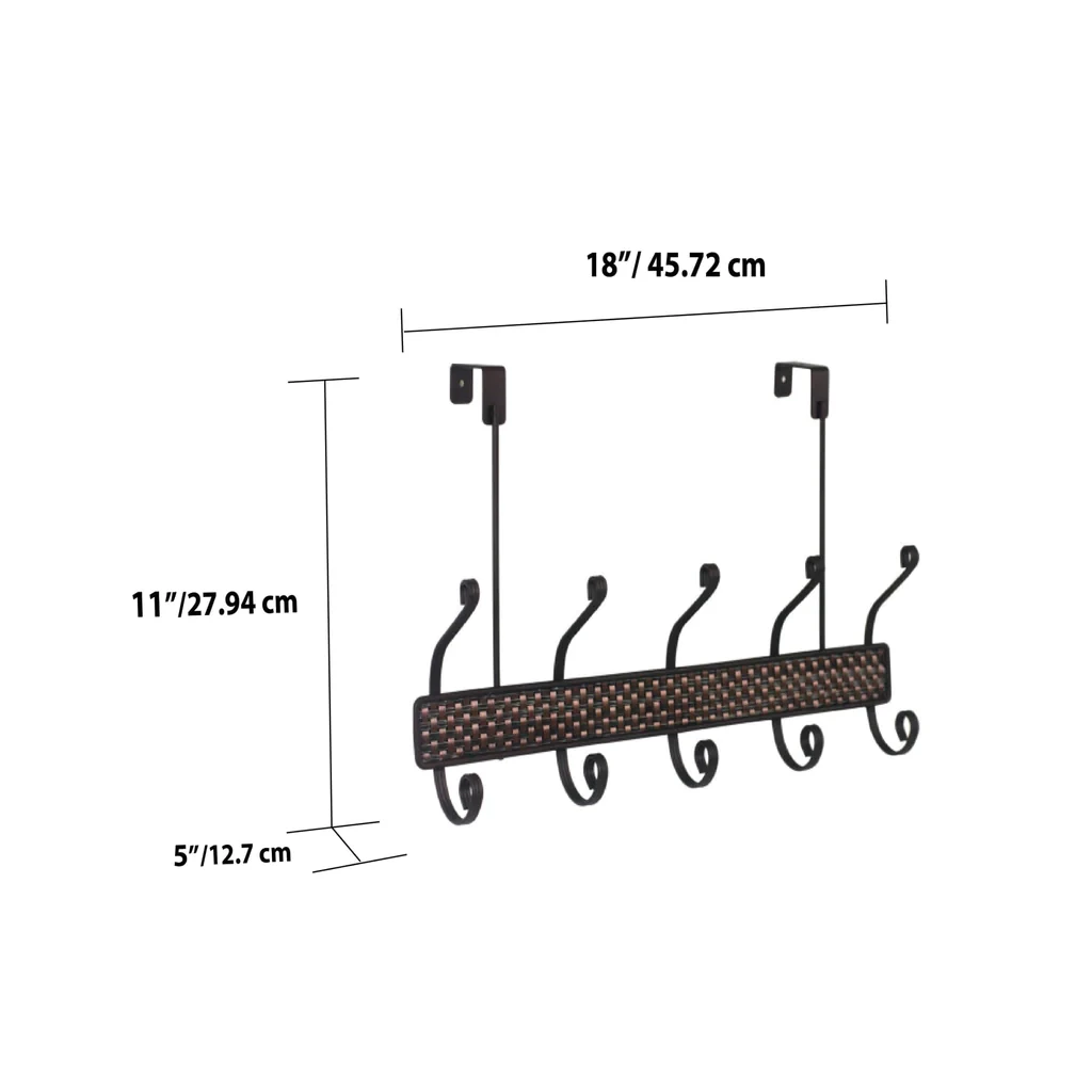 Pair your ensemble with a touch of modern elegance by using this bronze woven hanging rack. Made of durable steel, it features 6 curved hooks atop a rich, woven frame to beautifully display your snazzy collection of hats, scarves, coats, shirts or conveniently store your pup's leash. The 6 hook hanging rack easily fits most interior doors thanks to its sturdy metal bracket. With a ravishing bronze finish, it easily coordinates with a variety of decor.