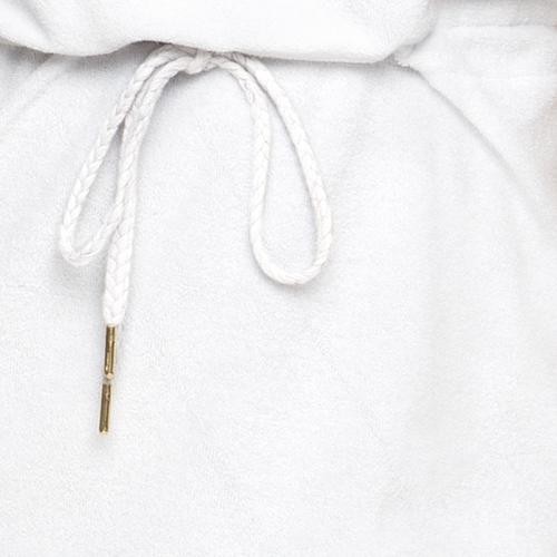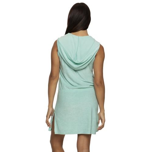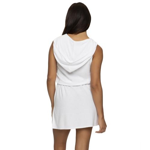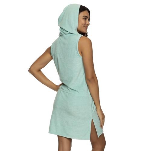 This sporty dress is perfect for warm weather, whether you're going to the beach or spending a day enjoying the sun. It has an innovative sleeveless design, V-neck, front drawstring for a figure-sculpting fit and a hood.