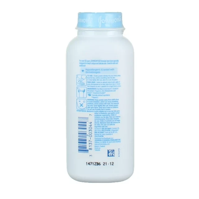 JOHNSON'S. Trusted since 1885.Baby PowderJ & JActive Ingredients:Zea Mays (Corn) Starch; Tricalcium Phosphate; FragranceFor baby, change wet and soiled diapers promptly, cleanse the diaper area, and allow to dry. Apply powder liberally as often as necessary, with each diaper change, especially at bedtime or anytime when exposure to wet diapers may be prolonged. Apply powder close to the body away from child's face. Carefully shake the powder into the diaper or onto the hand and apply to the diaper area. For you, use every day to feel dry, fresh, and comfortable.Uses:Soothes skin and absorbs moisture. JOHNSON'S Baby Powder Pure Cornstarch with its soft texture provides soothing protection by absorbing excess wetness from the skin to keep you dry and to help your skin feel smooth and fresh.Avoid contact with the eyes. For external use only. Do not use on broken skin. Keep powder away from child's face to avoid inhalation, which can cause breathing problems. Close tightly after use. SAFETY TIP: Keep this product out of reach of children.