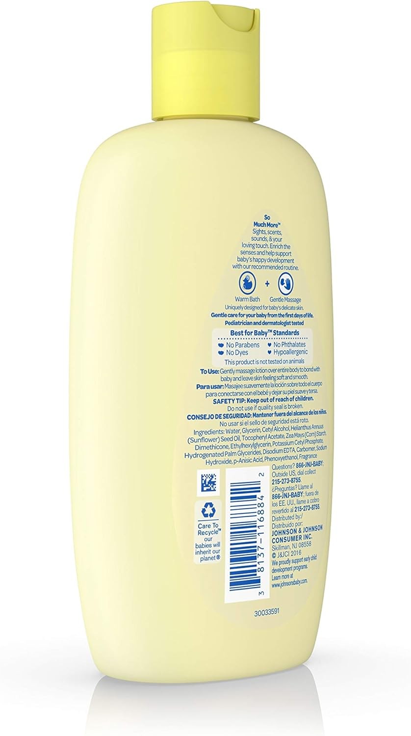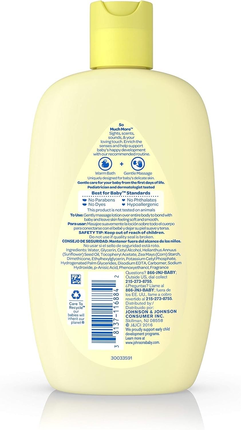 Use Johnson's Head-to-Toe Baby Lotion as part of a bath time routine. Designed for baby's delicate skin, this gentle after-bath baby lotion, with vitamin E, gently moisturizes delicate skin and leaves skin feeling soft and smooth. Suitable for newborns, it is clinically proven to be mild and provides gentle care for your baby from the first days of life. The pediatrician and dermatologist-tested formula is pH balanced to baby skin. Johnson's Head-to-Toe Baby Lotion is hypoallergenic and free of parabens, phthalates, and dyes.