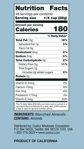 Kosher. Gluten-Free. 6g of Protein. Blanched | Once opened, store in refrigerator or freezer for optional freshness | Product of California.