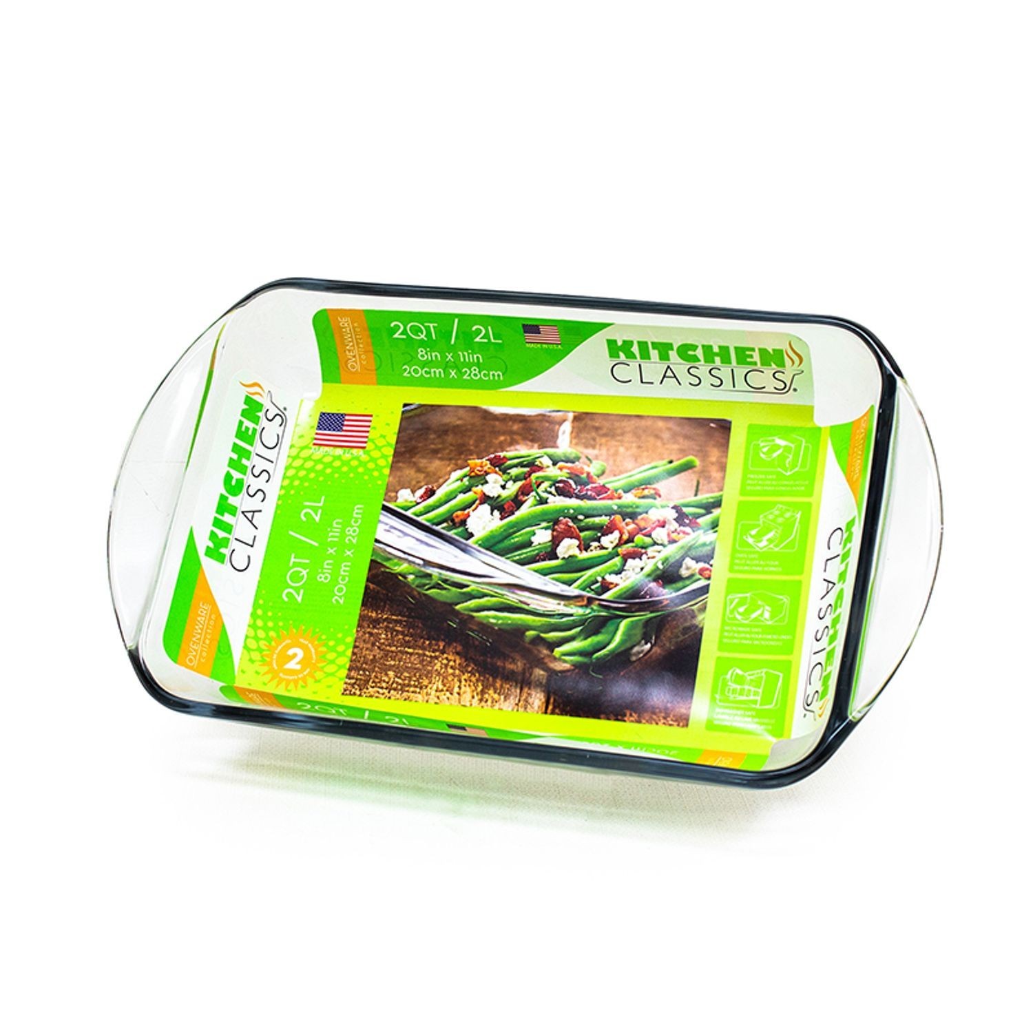 Kitchen Classics 67522LIB Clear Glass 2 Quart Baking Dish, Made in USA, Cavity measures 8.5 x 8.5 x 2.25 in, Exterior measures 11 x 9 x 2.5 in, 3 lbs, Comfortable Easy Grip Handles, Durable Dependable Premium Glass, Color Retail Inlay,