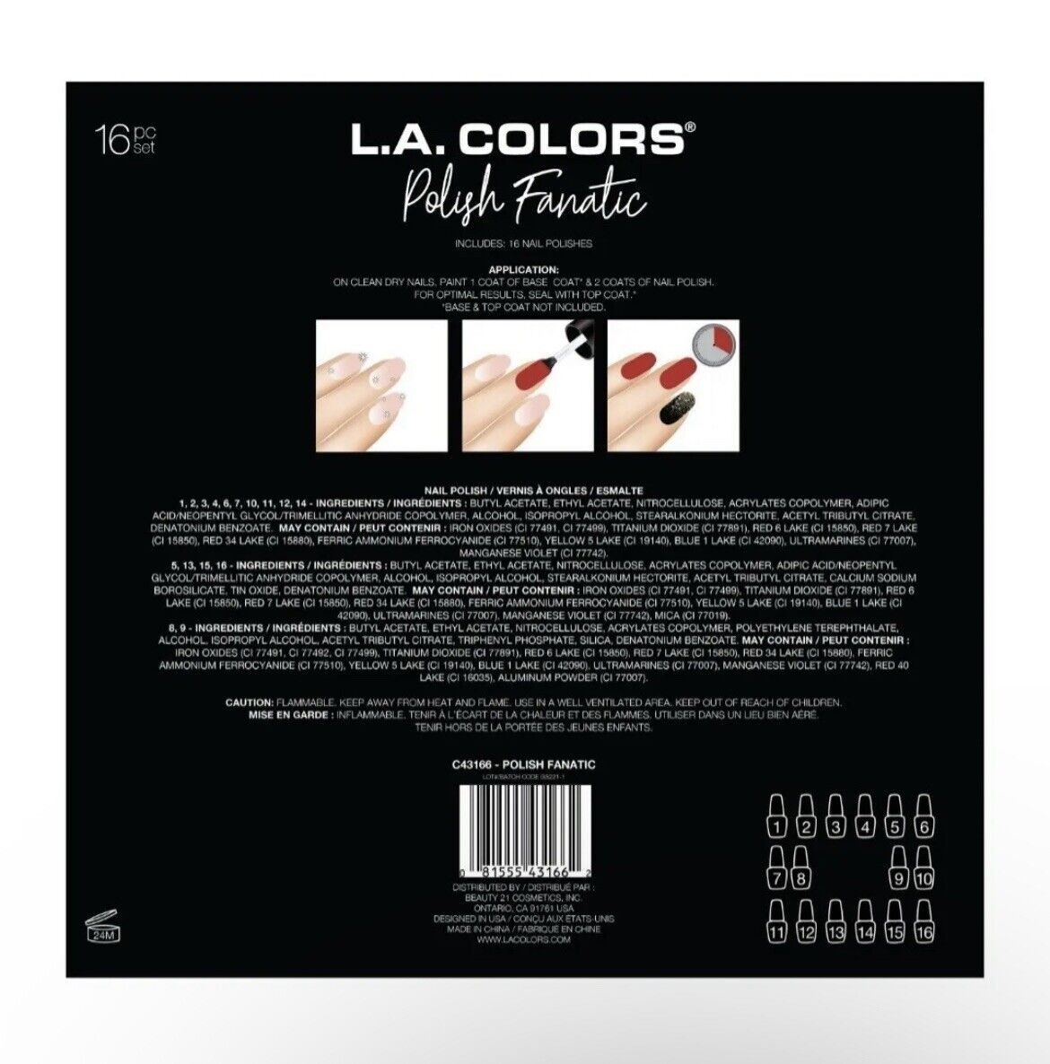 Deck the halls with lots of polish! The L.A. Colors 16-piece polish fanatic holiday gift set includes a colorful assortment of nail polishes for the polish lover in your life. Give your nails a vibrant lift with the L.A. Colors Color Craze Nail Polish with hardeners. Safe for fingers and toes, it delivers an elegant, shine in bright colors that blend with a variety of styles. This Craze nail polish is chip-resistant and easy to apply. Use it to achieve beautiful salon-quality results from the comfort of your home. This long-lasting nail polish is also available in varying shades, so you can choose different colors to personalize your look. You have neutrals, bolds, berries, and pastels in a mix of crème and glitter formulas that you can mix and match or layer for the most festive nails in the room. High Impact color and 7 free formula that will last all day. Cruelty Free Formula..