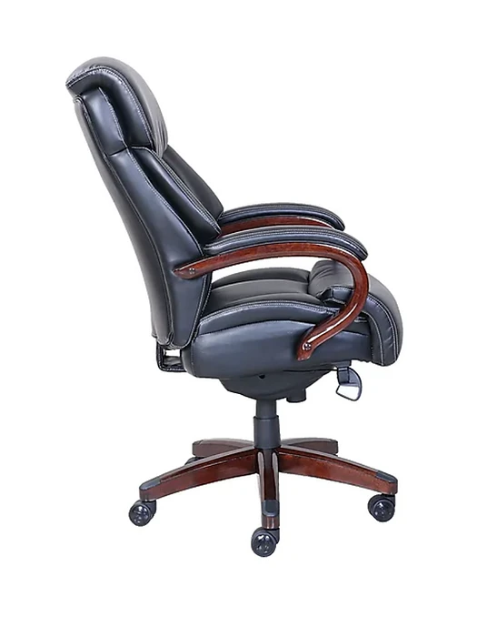 Create a bold, modern look for your office with this La-Z-Boy Bradley executive office chair. The rich bonded leather upholstery and contrast stitching deliver upscale style, while the plush ComfortCore cushioning ensures all-over support. A waterfall seat design promotes better circulation so you can sit comfortably for longer. This chair boasts pneumatic seat height adjustment, tilt tension and tilt lock, providing convenient customization options. Fixed padded loop arms offer a place to way to rest your shoulders, hands and wrists after marathon typing sessions. Featuring a wood-finish five-star base and rolling casters, this La-Z-Boy Bradley executive office chair moves effortlessly from one side of your office to the other.