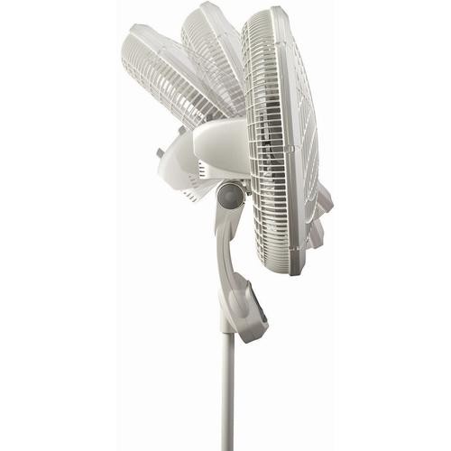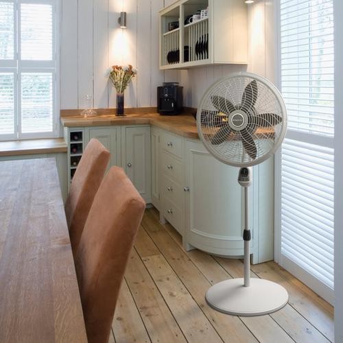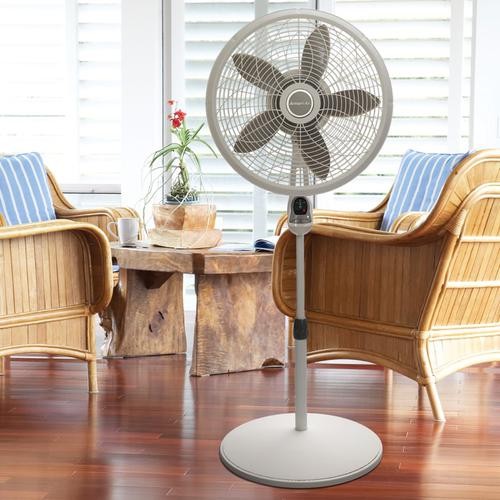 A 45 cm pedestal fan. It features 3 speeds, front electronic control, speed settings, oscillation, and a 4-hour timer function. Plus, you can conveniently operate the fan from your bed or seat with the multifunction remote control.