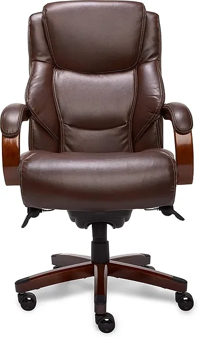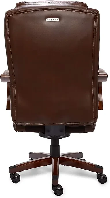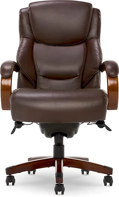 • WARM AND INVITING: Chestnut brown bonded leather upholstery with rich mahogany-stained wood