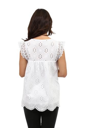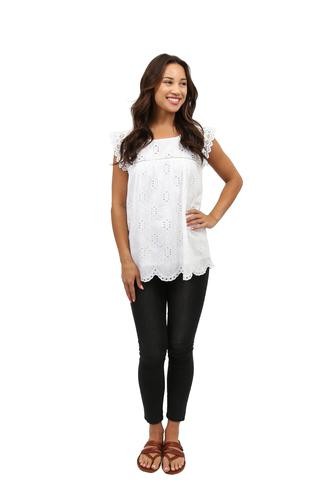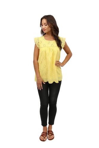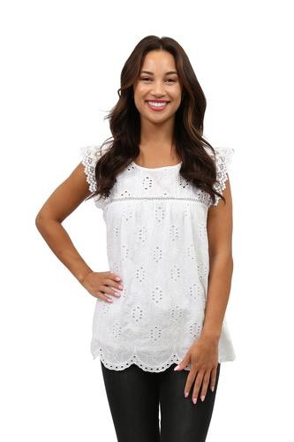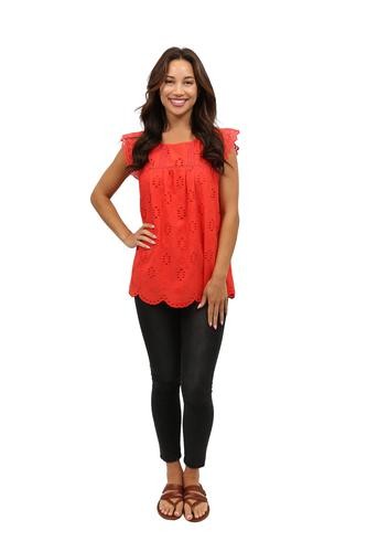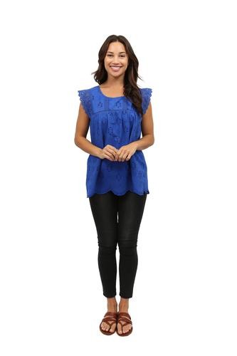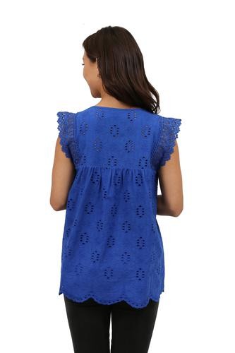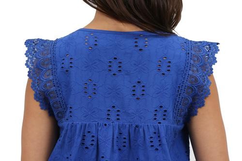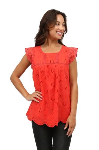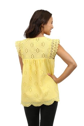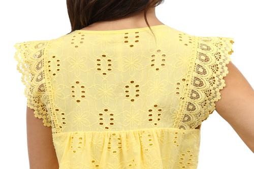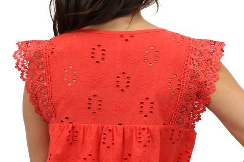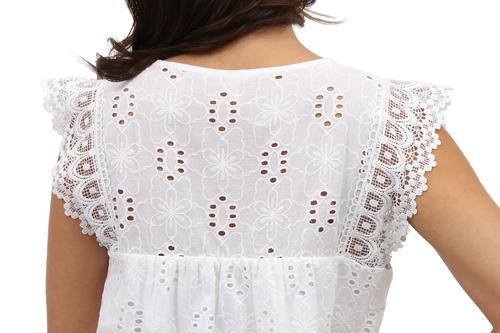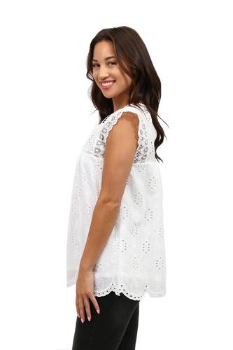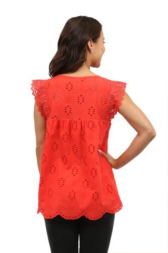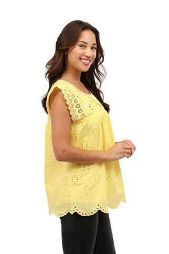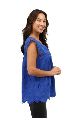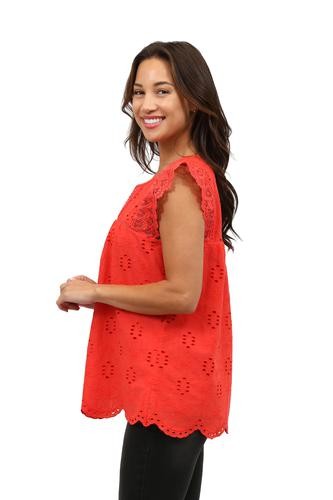 Flattering and versatile sleeveless crochet and lace trim eyelet top. The lace trim on eyelet fabric provides a feminine look to the comfortable crew neck top. The front and back panels are lined.