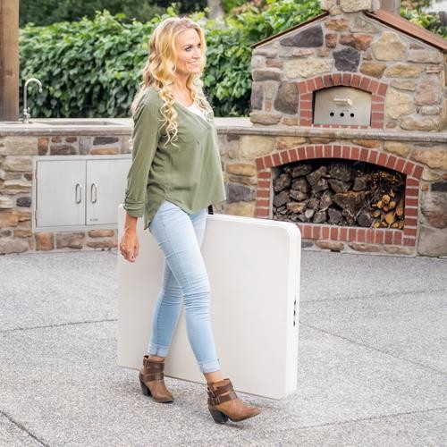 This practical 183 cm long folding table is suitable for commercial or home use, it can be easily folded and carried wherever you need it with its practical carrying strap.