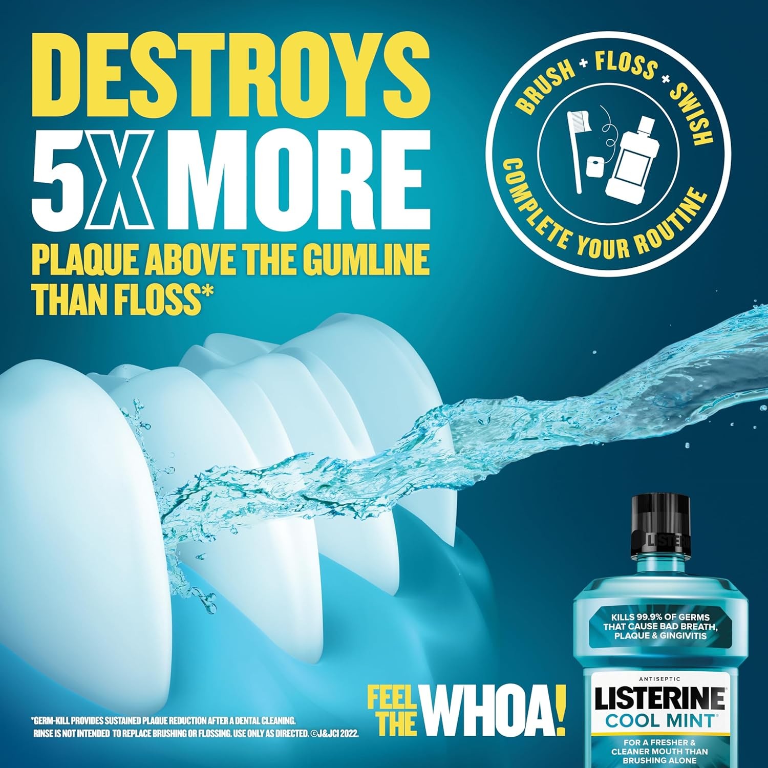 Listerine Cool Mint Mouthwash, in the net quantity of 500ml. It is specifically designed to reach places that a toothbrush cannot. It helps remove all the food particles, impurities and other debris even from the narrowest of gaps in between the teeth, thus eliminating germs and protecting the teeth from cavities and decay.