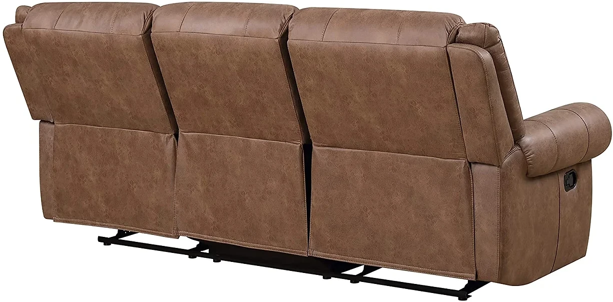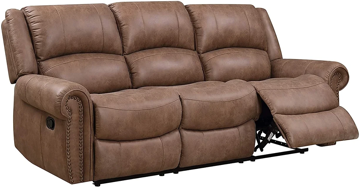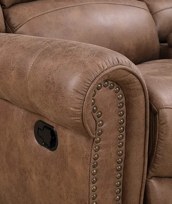 • The Nova reclining sofa features dual recliners, nailhead trim, and pillow back