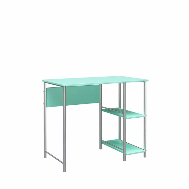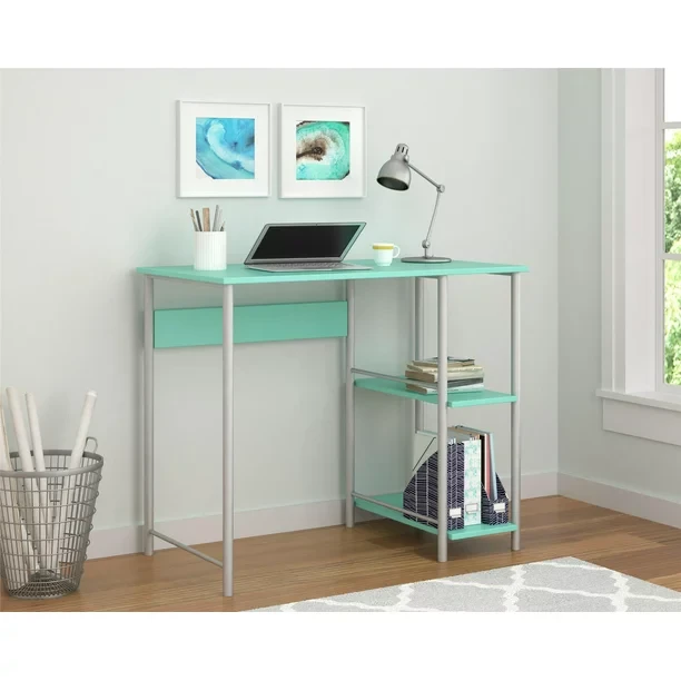 The Mainstays Basic Metal Student Desk is designed with your hardworking student in mind. It features side shelving storage for textbooks, notebooks, binders and electronic gear, allowing students to keep their work space organized. The spacious desk top offers room for your computer work and writing comfortably. With an eye-catching Silver metal frame and spearmint accents, this piece is as stylish as it is functional. Keep this Student Desk in a bedroom, dorm room or an office without taking up too much space.