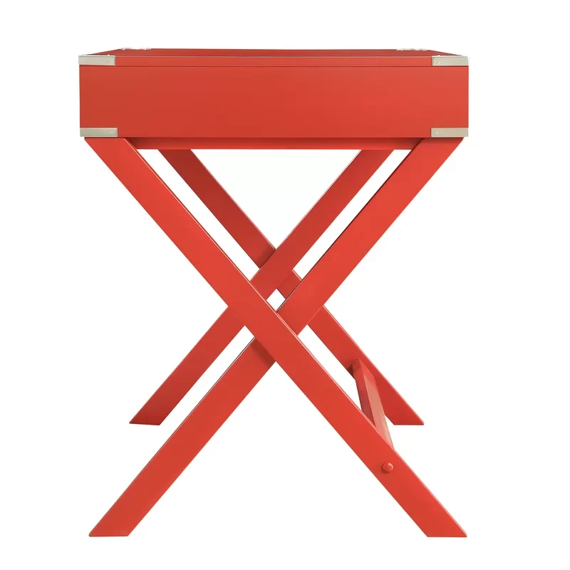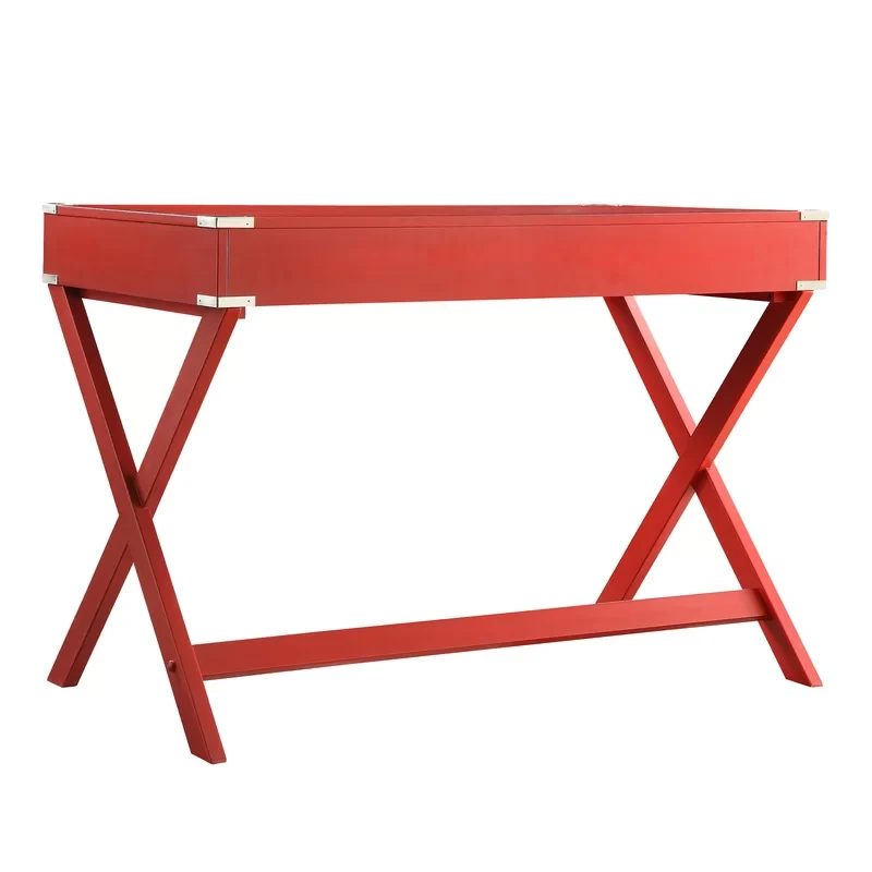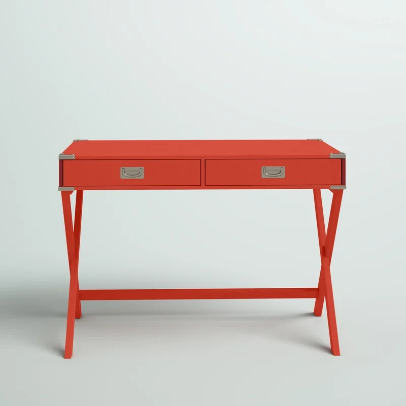 This clean-lined writing desk is an ideal workspace in your home office. It's built from solid and engineered wood, and it rests on an X-frame with a trestle base for a modern look. The rectangular desktop has plenty of space for a laptop or computer, as well as notebooks and other writing needs. The two soft-close drawers with metal pull provide a place for pens, paperclips, and other supplies. We also love how the French dovetail construction adds an extra layer of accent to your space. This desk has a finished back, so you're free to place it anywhere.