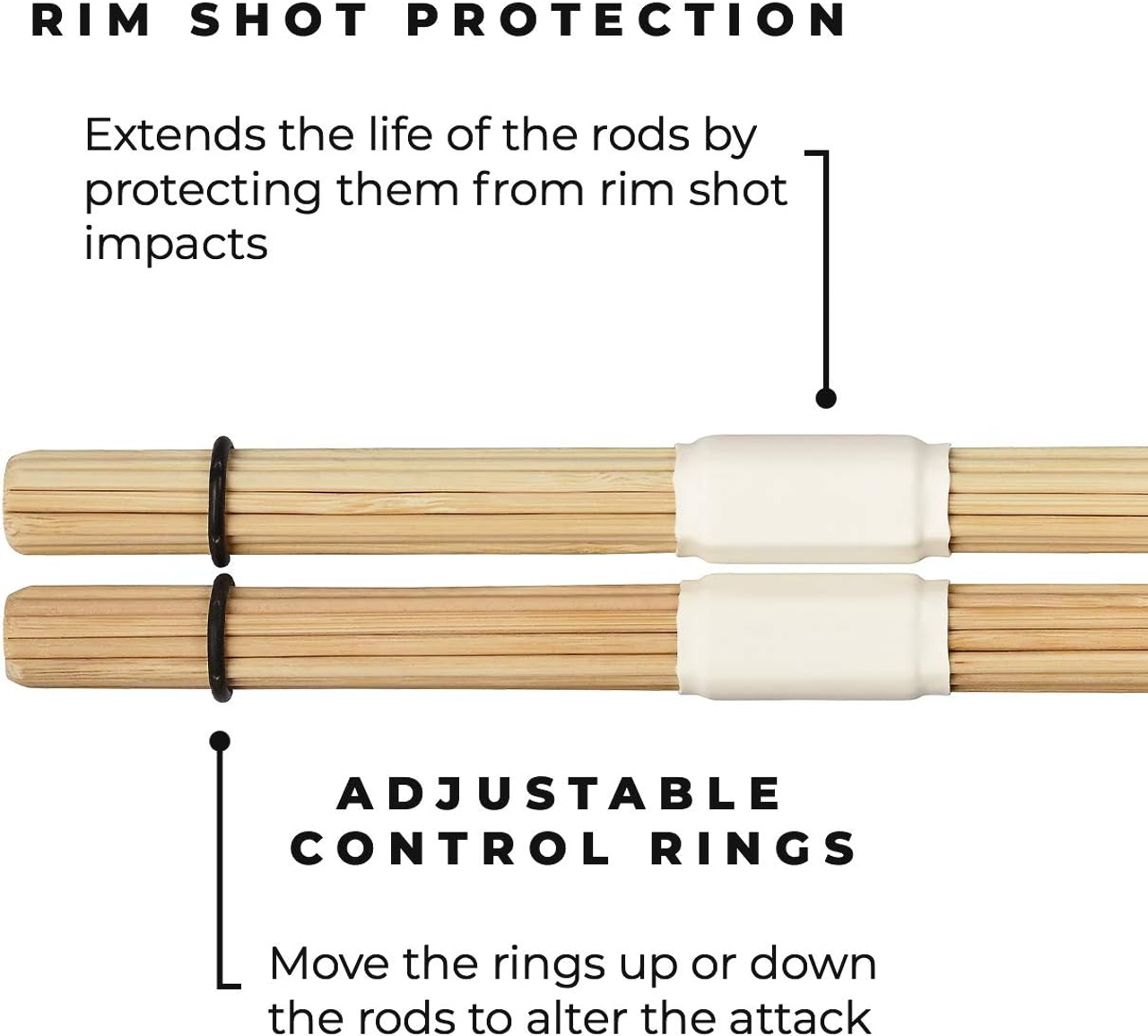 - Adjustable control rings — moving the control rings up or down the rods changes the amount of spread toward the end which alters their attack — for a fatter sound, move the rings back toward your hands, or place them closer to the tip for sharper effects