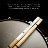 - Many uses — our multi-rod bundle sticks can be used on all types of percussion instruments from cajon to drum kit where volume control is needed or the music calls for a different flavor — the skewed tips deliver a well-rounded attack on all surfaces