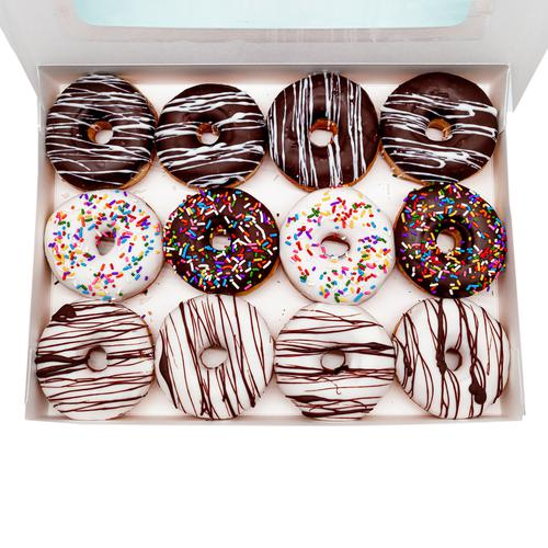 Member's Selection Freshly Baked Assorted Doughnuts 12 Units | Includes: 4 chocolate-covered doughnuts, 4 vanilla-covered doughnuts, 2 chocolate-covered doughnuts with colored sprinkles, and 2 vanilla-covered doughnuts with colored sprinkles | Contains allergens such as: Wheat, soy, eggs, and milk | Keep at room temperature.
