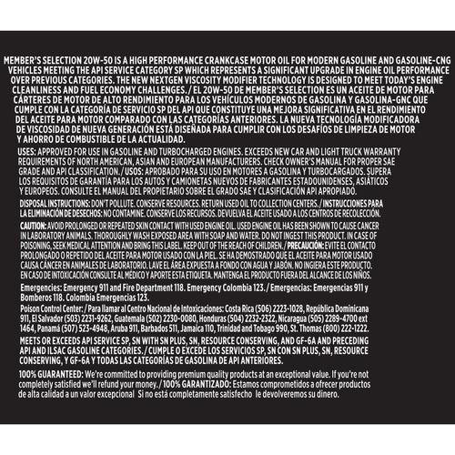 Member's Selection 20W-50 is a high-performance Crankcase Motor Oil for modern Gasoline and Gasoline-CNG vehicles meeting the API service category SP which represents a significant upgrade in engine oil performance over previous categories. The new Nextgen viscosity modifier technology is designed to meet today's engine cleanliness and fuel economy challenges.