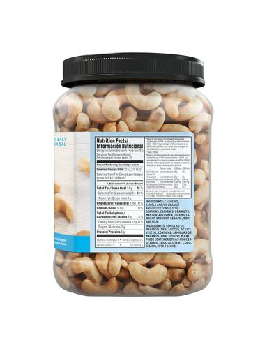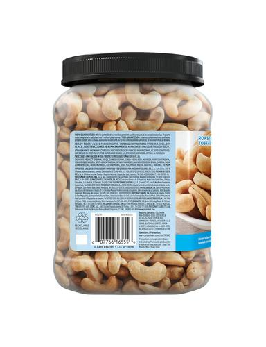 Ready to eat | Store in a cool and dry place | No salt. Roasted cashews in a convenient container with a twist-off lid. Net Weight: 32 oz