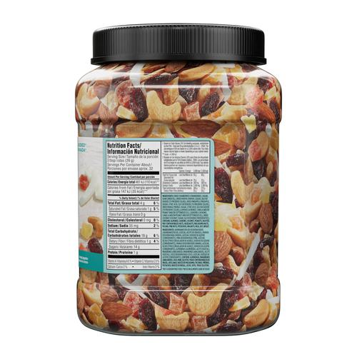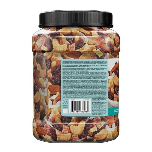 Trail mix: dried cranberries, dried papaya, dried pineapple, dried mango, almonds, cashews, and dried coconut. May contain: peanuts, brazil nuts, hazelnuts, macadamia nuts, pecans, pine nuts, pistachios, walnuts, milk, soy, and wheat. No salt added | Ready to eat | Store in a cool and dry place.