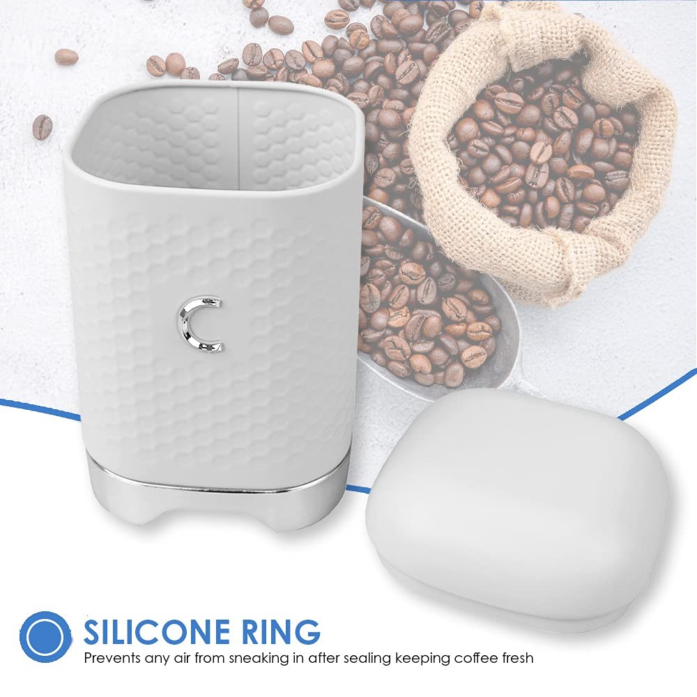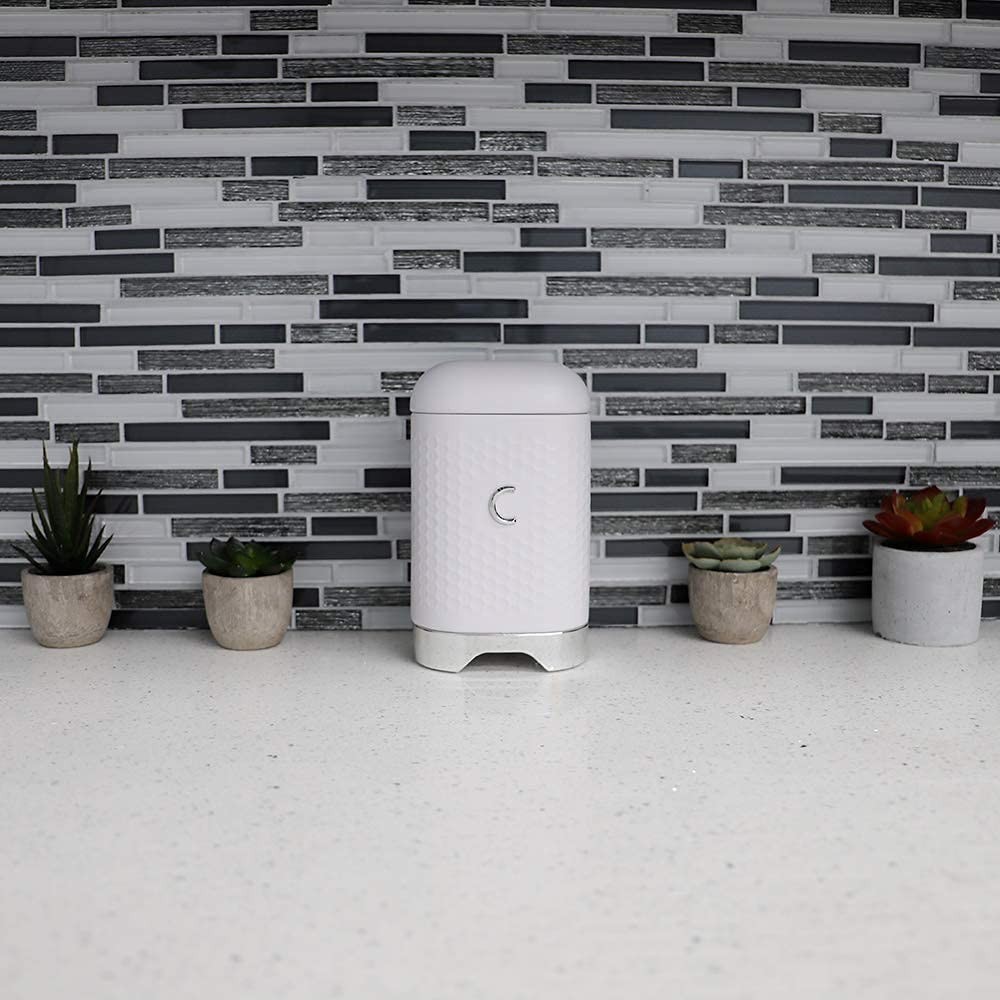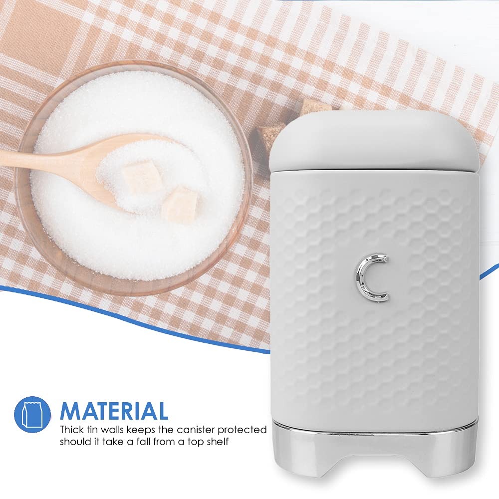 • Whether you need a scoop of coffee or a spoonful of sugar to add a touch of sweetness, this large canister will keep it all fresh and close at hand for every dish you need to prepare. Its heavy duty solid shape is deep enough to hold large quantities of sugar or coffee. With no tricky latches, it's a breeze to open and use. Topped with a fitted lid that keeps moisture, humidity, and bugs from entering in. A thick tin exterior keeps the canister protected should it drop from a top shelf. It features a beautiful honeycomb pattern and an elegant label making it perfect to set on your kitchen counter for a pop of texture and color. Besides tea, use it to also store trail mix, sugar, and coffee beans, or place small jewelry and rubber bands inside. Item dimensions may differ slightly due to the unique nature of the product. Color and finish may also differ slightly from the images shown due to the differences in monitor displays. Perfect for keeping granulated sugar, brown sugar, confectioner's sugar and powdered sugar close at hand Lid is tightly fitted to prevent contents from going stale. The wide mouth helps to scoop out large portions. Thick tin walls keep the canister protected should it take a fall from a top shelf. Use to also store trail mix, tea leaves, flour, and coffee beans. Dimensions: 4.50" L x 4.50" W x 7.50" H. Weight: 0.80 lbs.
