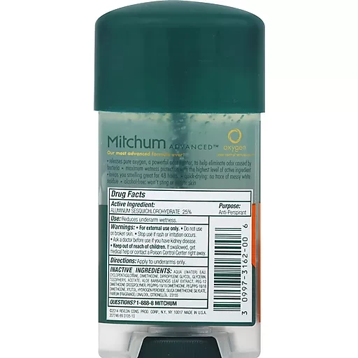 Mitchum Men Clear Gel Sport Anti-Perspirant & Deodorant 2.25oz. Our Most Advanced Formula Ever! Oxygen Odor Control Technology. 48 Hour Protection. Alcohol Free - Won't Sting or Irritate Skin. Our exclusive formula releases pure oxygen, a natural odor fighter, to help eliminate odor caused by bacteria. Maximum wetness protection with the highest level of active ingredient. Keeps you smelling great for 48 hours. Quick-drying gel leaves no trace of messy white residue. Warnings: For external use only. Do not use on broken skin. Stop use if rash or irritation occurs.