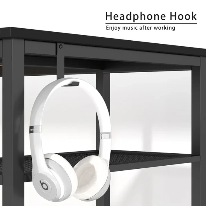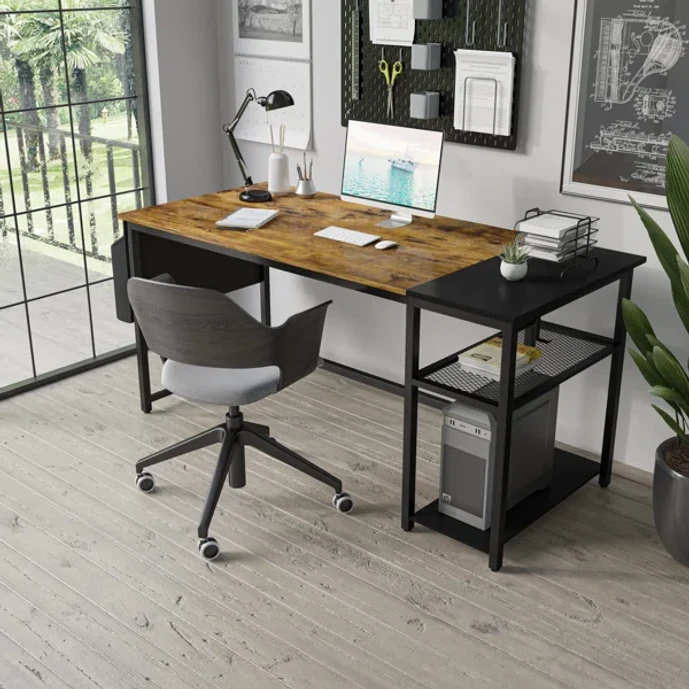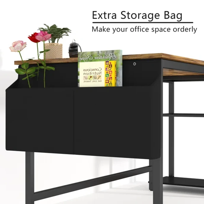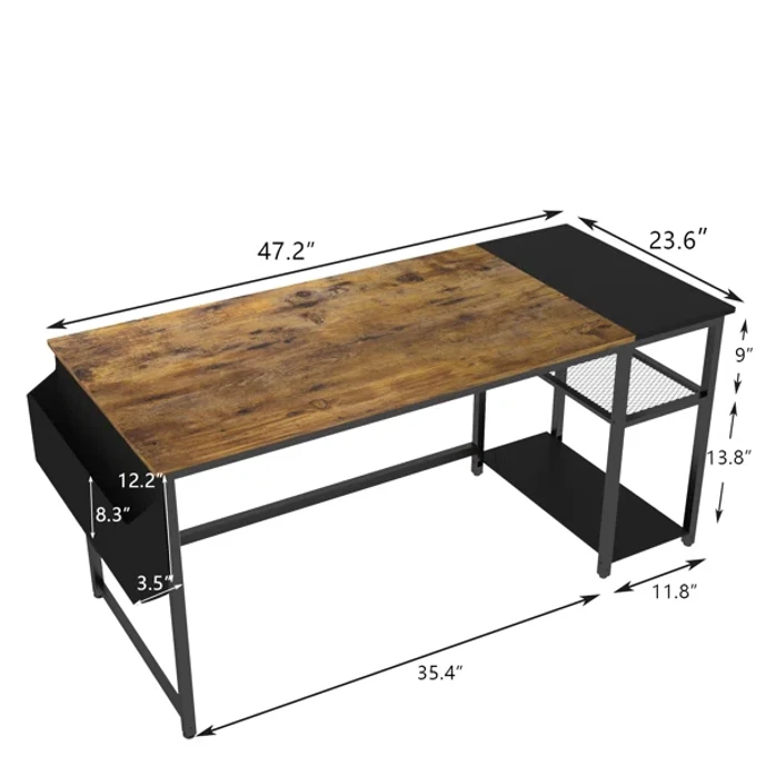 This computer desk features clean lines and mixed materials to give your home office or living room a modern industrial look. It has a powder-coated steel base in black, with stretcher bars that add plenty of support for your workspace accessories. Engineered wood surfaces showcase a rich brown hue that brings some rustic charm to your space. Two shelves to the right let you store books, files, and other important documents while a convenient storage bag to the left holds smaller office supplies. Plus, an iron hook keeps headphones at the ready whenever you need them.