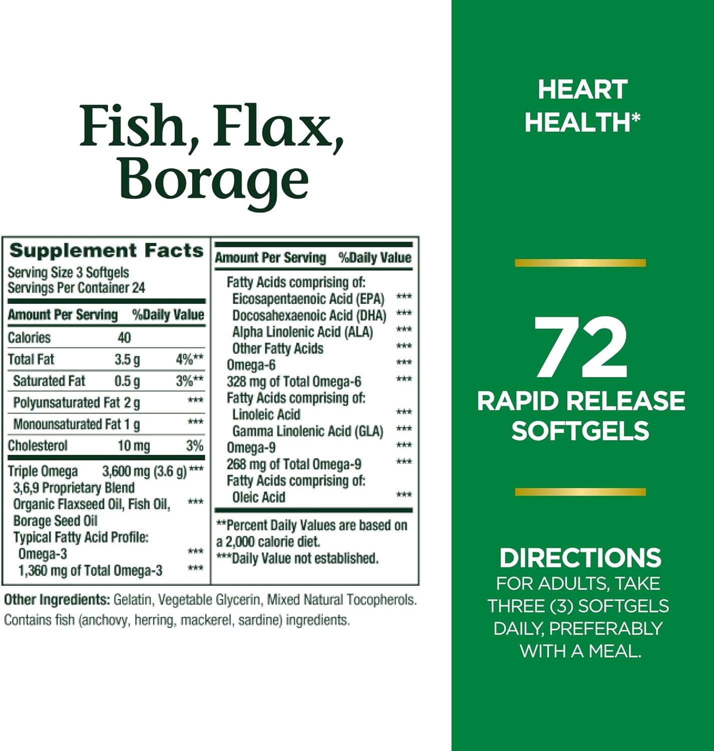 - Nature's Bounty Fish, Flax, Borage With Omega 3-6-9, 1200 Mg, 72 Ct:
