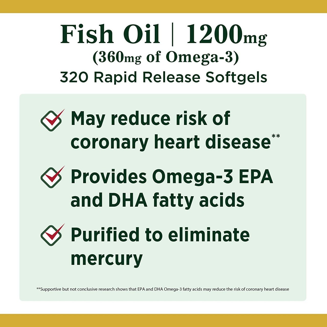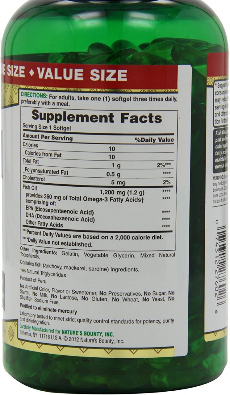 Nature's Bounty Fish Oil 1200 mg contains EPA and DHA, two Omega-3 fatty acids that help support and maintain the health of your cardiovascular system.* Omega-3 fatty acids are considered “good” fats important for cellular, heart and metabolic health and help maintain triglyceride levels already within a normal range.