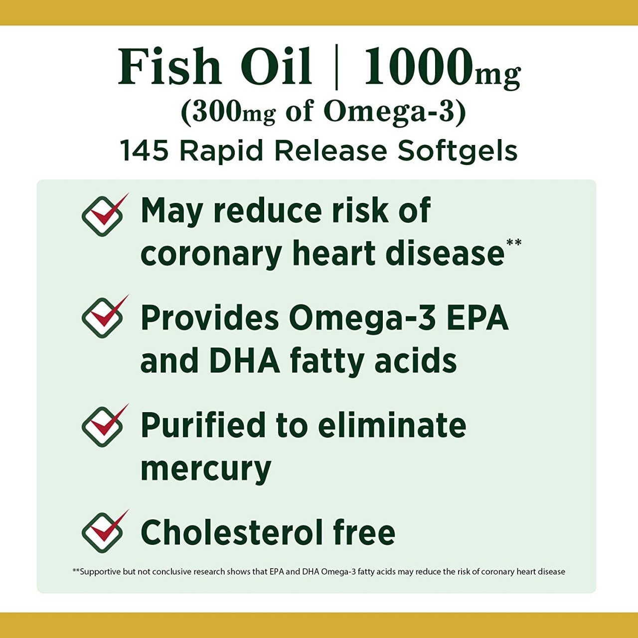 Fish Oil Rapid Release Softgels by Nature’s Bounty provide many important healthh benefits for your body. Nature’s Bounty Rapid Release Omega-3 Fish Oil Softgels contain both DHA and EPA, two Omega-3 fatty acids that are found naturally occurring in fatty fish. Omega-3 fatty acids are essential nutrients that play an important role in the health of your heart and cardiovascular system*. Taking Nature’s Bounty Omega-3 Fish Oil Softgels may help reduce the risk of coronary heart disease**. And because these high-quality Omega-3 Fish Oil Softgels are from the trusted vitamin and supplement experts at Nature’s Bounty, you can be sure they are purified to eliminate mercury, contain no shellfish, and are non-GMO, sugar- and gluten-free. Nature’s Bounty Omega-3 Fish Oil Softgels are part of a line of heart health supplements backed by nearly 50 years of science, innovation and expertise. **Supportive but not conclusive research shows that consumption of EPA and DHA Omega-3 fatty acids may reduce the risk of coronary heart disease. One serving of Fish Oil provides 300 mg total of EPA, DHA and other Omega-3 fatty acids. See nutrition information for total fat and cholesterol content.
