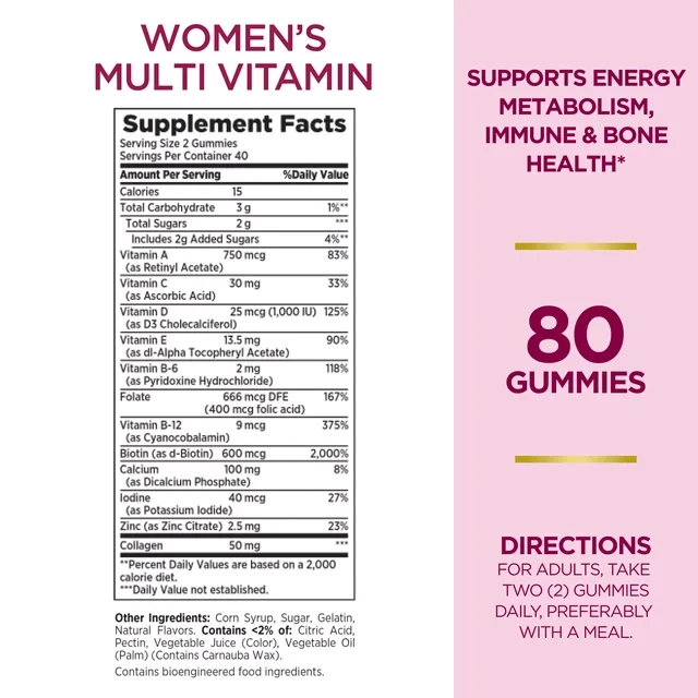 Nature's Bounty Optimal Solutions Women's Multivitamin Gummies are dietary supplements that provide more than 10 key nutrients to support your body.* These vitamin, mineral, and Collagen supplements have no artificial flavors or sweeteners. Each daily vitamin includes Vitamin D for immune support, Calcium for bone health, antioxidant Vitamin E and Vitamin C, and more.* These daily vitamin supplements also offer 50 mg of Collagen per serving, as well as B Vitamins to provide energy support by helping convert food into energy.* Adults can take two raspberry-flavored gummies per day, preferably with a meal.
