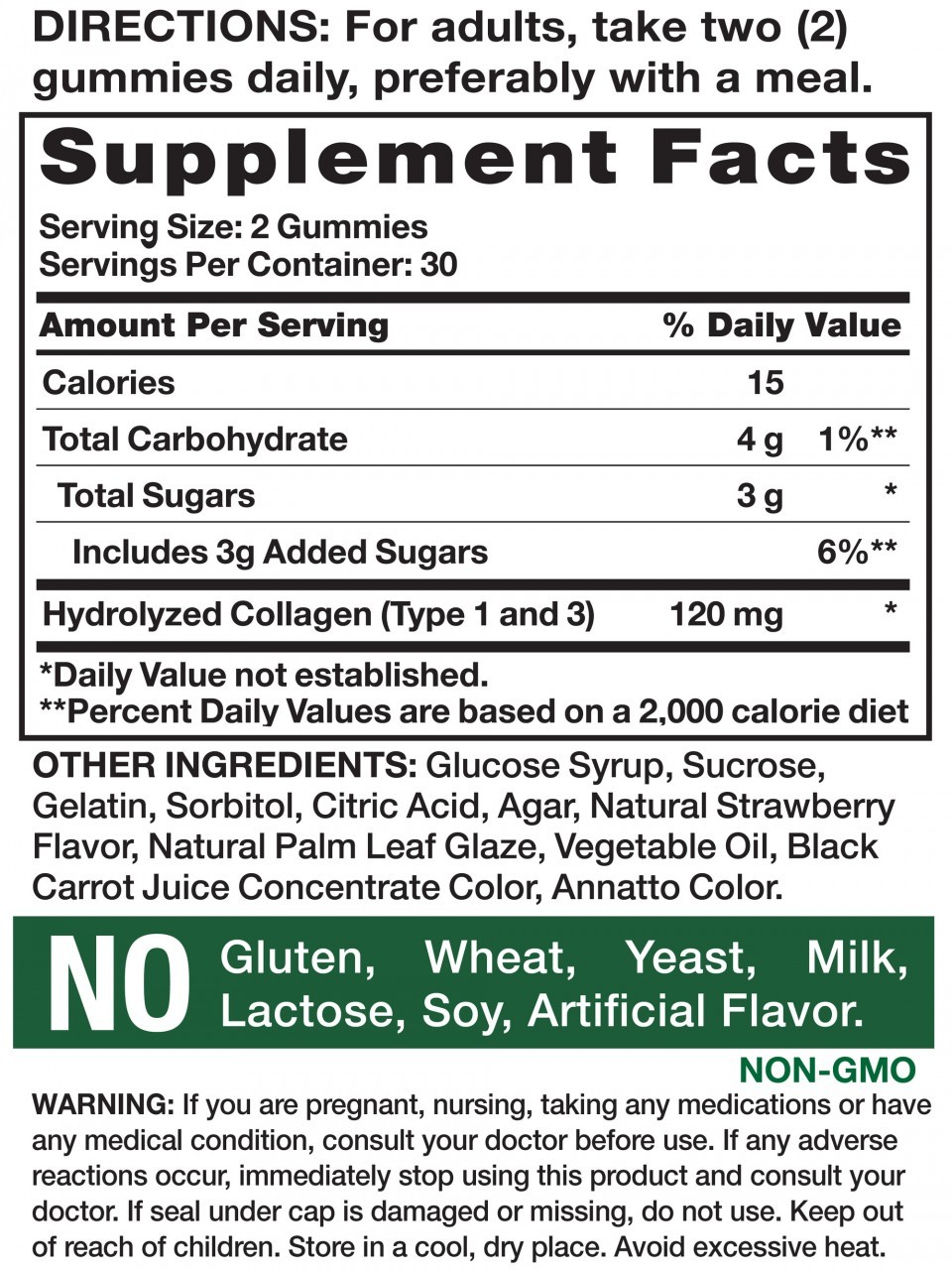 Ingredients: 2 Gummies: Calories 20 Total Carbohydrate 4 g (1% Daily Value*) (Total Sugars 4 g [**Daily Value not established] [Includes 4 g Added Sugars 8% DV*]) Hydrolyzed Collagen (Type 1 and 3) 120 mg (**) Glucose Syrup Sucrose Gelatin Sorbitol Citric Acid Agar Natural Strawberry Flavor Natural Palm Leave Glaze Vegetable Oil Black Carrot Juice Concentrate Color Annatto Color *Percent Daily Values are based on a 2000 calorie diet