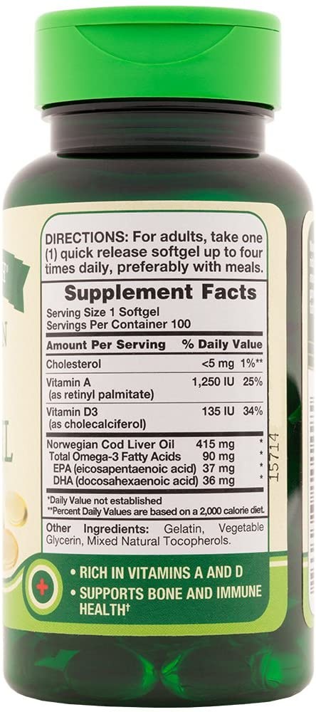 Norwegian Cod Liver Oil supplies the body with a rich source of vitamins A and D, which help maintain normal immune system function and promote strong bones.* This product also contains fatty acids EPA and DHA to support overall health.* Gluten free. *These statements have not been evaluated by the Food and Drug Administration. This product is not intended to diagnose, treat, cure or prevent any disease.