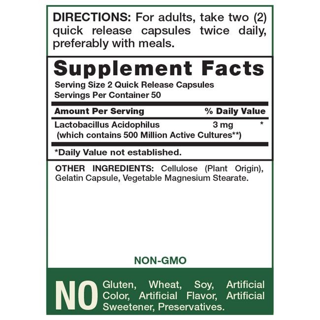 Benefit from the natural wonder of Acidophilus! Probiotics are friendly bacteria that naturally colonizes in your intestines and supports the health of your digestive tract.† Naturally found in the human digestive tract, Acidophilus promotes the delicate microflora balance of the digestive tract, supporting overall health and optimal function while enhancing nutrient absorption throughout the intestines.† Our specially designed stomach friendly formula provides you with 500 million active cultures per two quick release capsules, making it easier than ever to add probiotics to your daily routine.**