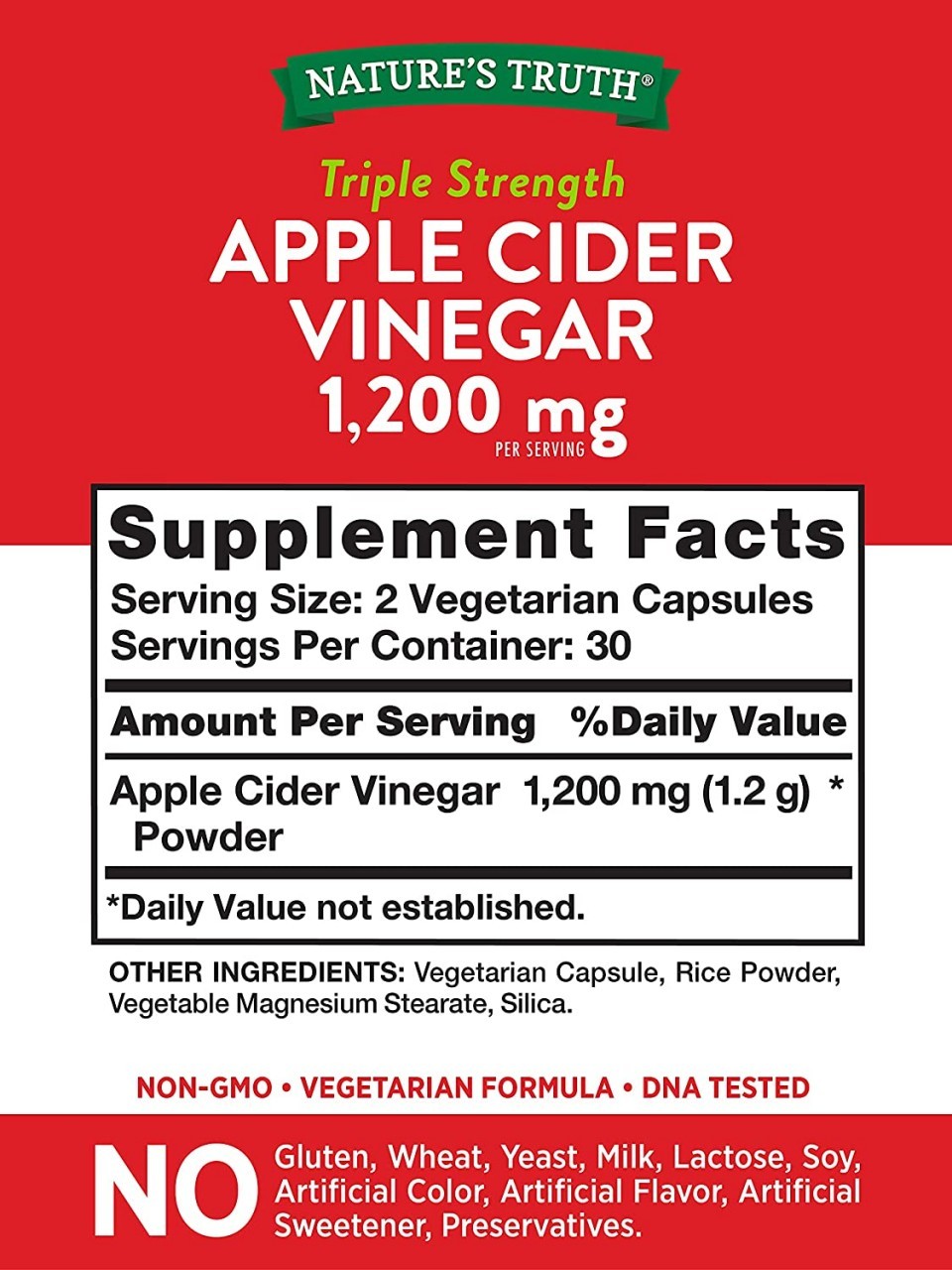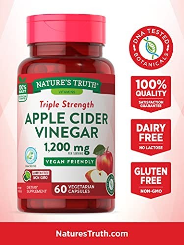 About Apple Cider Vinegar: Nature's Truth now carries a mega-strength Apple Cider Vinegar that delivers 1200 mg of this traditional ingredient per serving. Our extra strength formula is fast absorbing for maximum support to be used by both men and women. Each 600 mg Quick-Release capsule is packed with naturally-occurring vitamins and nutrients for advanced wellness.* Our Apple Cider Vinegar will leave you with a happy belly. Nature's Truth pill form Apple Cider Vinegar is a premium healthy supplement that comes in a light weight plastic bottle! Our Quick release capsules can be easily packed into packets for a convenient travel size!