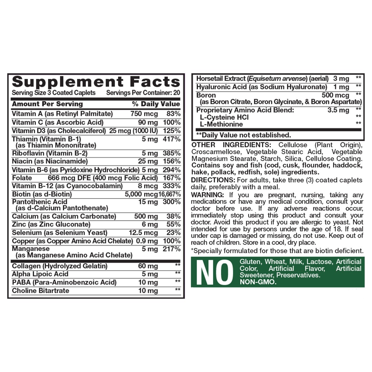 Ingredients: Vitamin A, Vitamin C, Vitamin D3, Thiamin, Riboflavin, Niacin, Vitamin B-6, Folate, Vitamin B-12, Biotin, Pantothenic Acid, Calcium, Zinc, Selenium, Copper, Manganese, Collagen, Alpha Lipoic acid, Paba, Choline Bitartarte, Horsetail Extract, Hyaluronic Acid, Boron, Proprietary Amino Acid Blend. Other Ingredients: Cellulose (Plant Origin), Croscarmellose, Vegetable Stearic Acid, Vegetable Magnesium Stearate, Starch, Silica, Cellulose Coating.