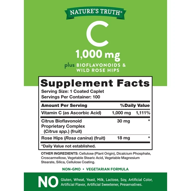 Nature’s Truth® Vitamin C 1,000 mg plus wild Rose Hips caplets are made with only the very best ingredients. They are vegetarian friendly, Non-GMO, gluten free, wheat free, yeast free, milk free, lactose free, and soy free. They were created without any artificial colors, artificial flavors, artificial sweeteners, or preservatives.