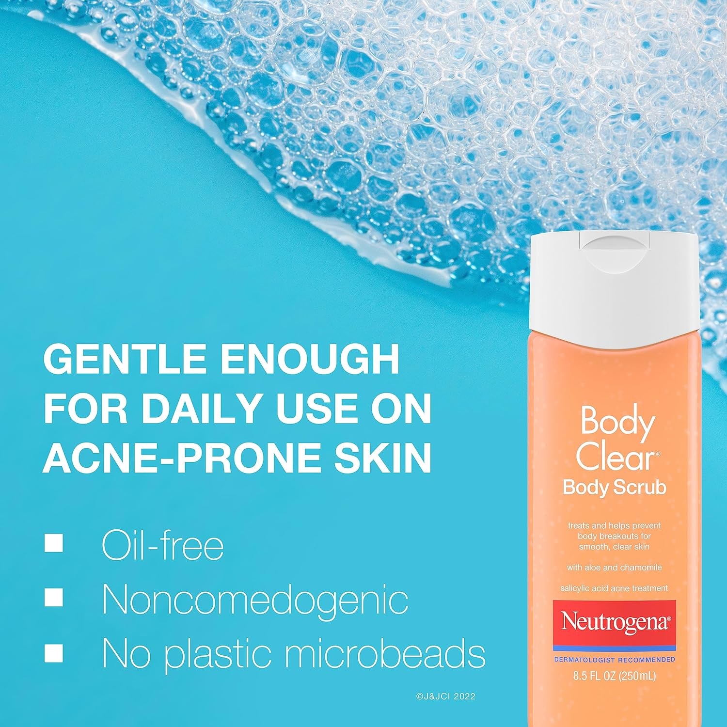 Treat acne on the back, chest and shoulders with Neutrogena® Body Clear® Body Scrub with 2% Salicylic Acid acne treatment. Specially formulated for body acne, this effective scrub with gentle exfoliators sweeps away dead skin and cleans deep into pores to give you clear, smooth skin on the back, chest and shoulders.