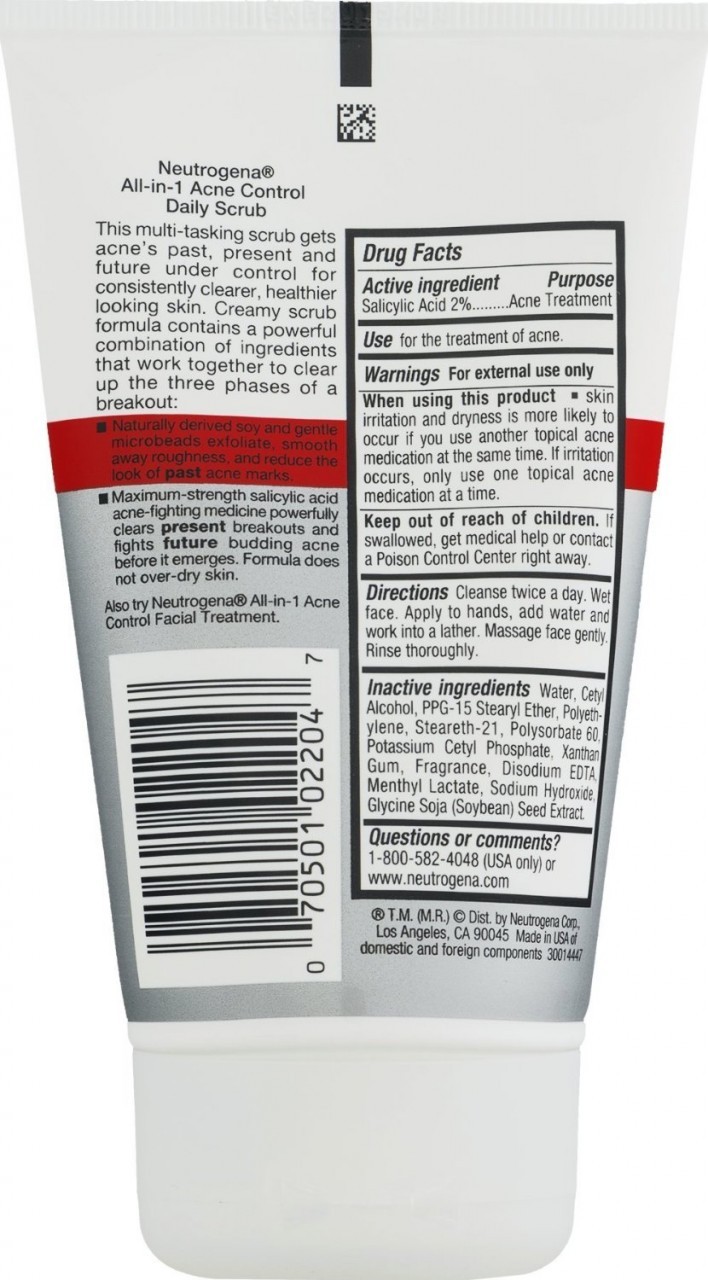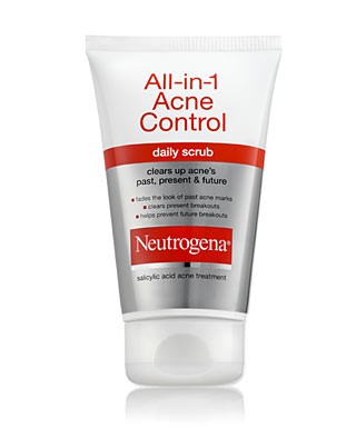 All-in-1 Acne Control Daily Scrub is a multi-tasking scrub that gets acne's past, present and future under control for consistently clearer, healthier looking skin. The creamy scrub formula contains a powerful combination of ingredients that work together to clear up the three phases of a breakout, without overdrying the skin. Naturally derived soy and gentle microbeads exfoliate, smooth away roughness, and reduce the look of past acne marks. Maximum-strength salicylic acid acne-fighting medicine powerfully clears present breakouts and fights future budding acne before it emerges.