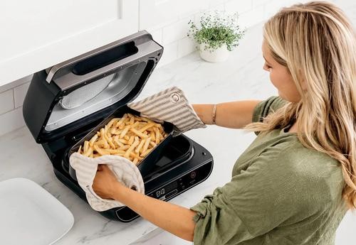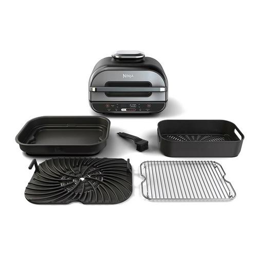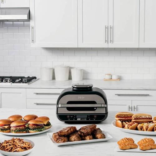This Ninja Foodi XL 5-in-1 indoor kitchen appliance grills, roasts, bakes, dehydrates, and air crisps using a 4-quart crisper basket. Provides heat at 500 degrees Fahrenheit for rapid cyclonic air circulation and surround searing. Variable fan speed and digital display Grill. Control settings at low, medium, high, and max from 105 to 500 degrees Fahrenheit. Temperature-controlled grill gates, splatter, shields, and cool-air zone reduce smoke and create char-grilled marks.
