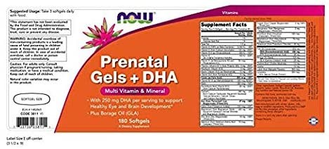 NOW® Prenatal Gels + DHA is a specially formulated multivitamin and mineral supplement for pregnant women and women in their child-bearing years. In addition to essential vitamins and minerals, this high-quality supplement includes GLA from borage oil and delivers 250 mg DHA per serving to support healthy eye and brain development.* Natural color variation may occur in this product.