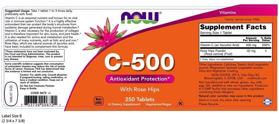 NOW Supplements, Vitamin C-500 with Rose Hips, Antioxidant Protection, 250 Tablets