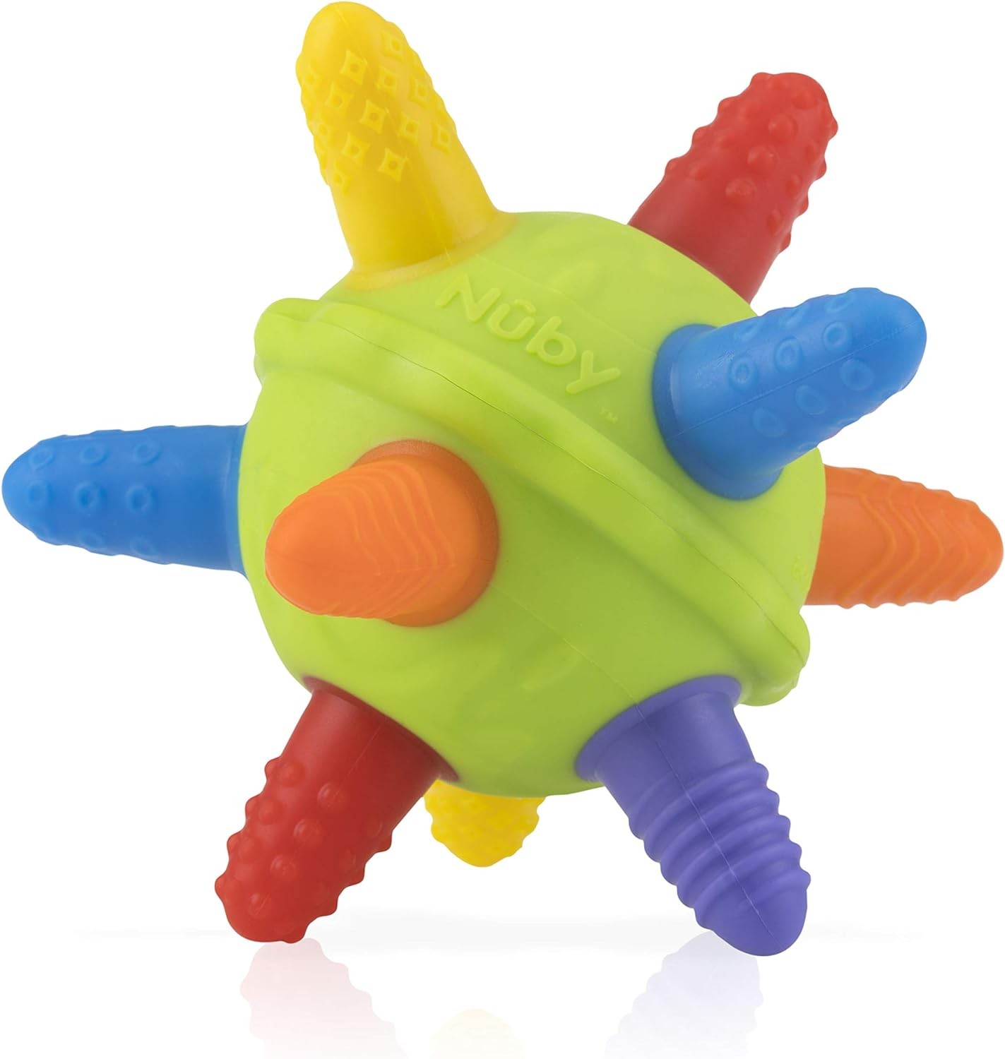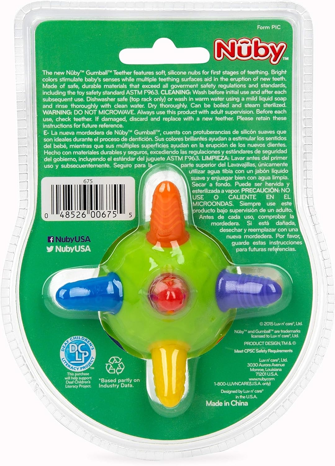 The new Nuby Gumball Teether features soft, silicone nubs for first stages of teething. Bright colors stimulate the baby's senses while multiple teething surfaces aid in the eruption of new teeth.