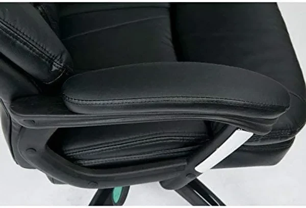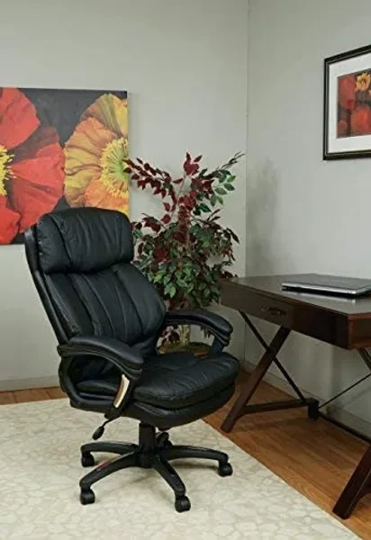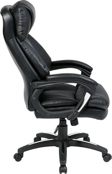 Oversized Faux Leather Executive Chair with Padded Loop Arms. Faux Leather Seat and Back with Built-in Lumber Support. One Touch Pneumatic Seat Height Adjustment. Locking Tilt Control with Adjustable Tilt Tension. Padded Nylon Arms with Polished Aluminum Accents. Heavy Duty Nylon Base with Polished Aluminum Accents and Dual Wheel Carpet Casters